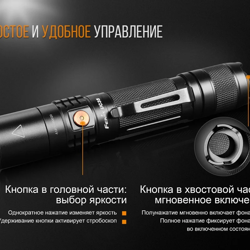 З допомогою прогумованої торцевій кнопки забезпечується швидкий доступ до таких режимів роботи як «Стробоскоп» і «Турбо». При необхідності, можна встановити фірмові аксесуари, наприклад, виносну кнопку і кріплення під зброю, завдяки чому модель Fenix UC35 V2.0 можна буде використовувати в якості ручного ліхтаря, так і в якості підствольного.