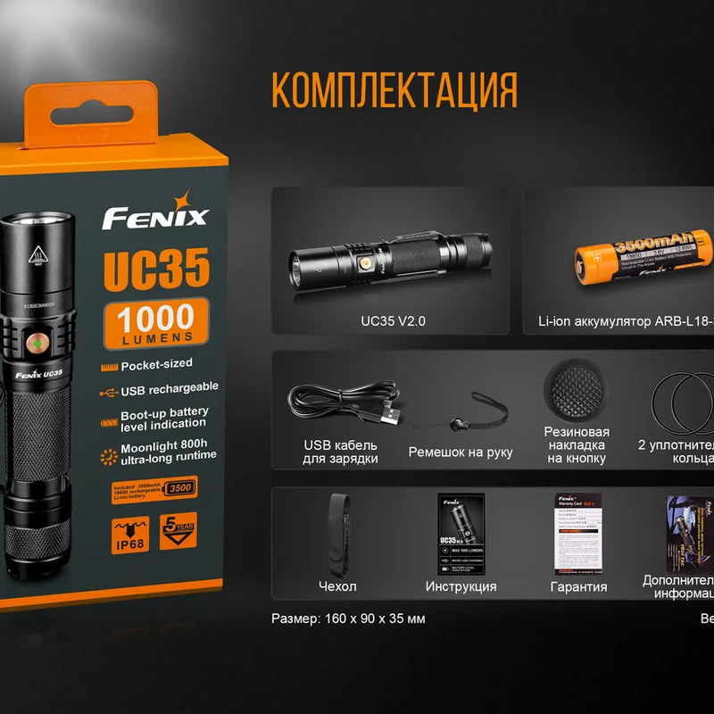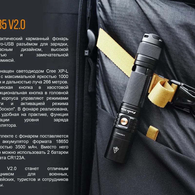 Компактний, легкий і в той же час потужний — це Fenix UC35 V2.0. Завдяки установці сучасних комплектуючих, дана модель має не тільки відмінною яскравістю, а і досить низьким енергоспоживанням, за рахунок чого здатна працювати довше ніж аналоги від інших виробників.