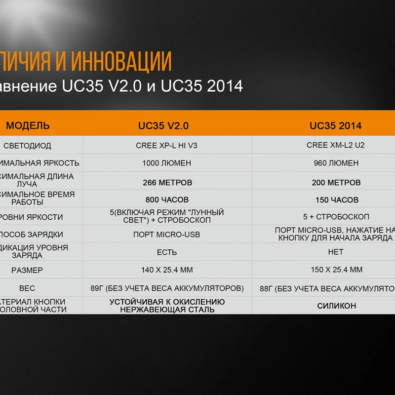 - модель Fenix UC35 V2.0 має вбудований цифровий стабілізатор струму;