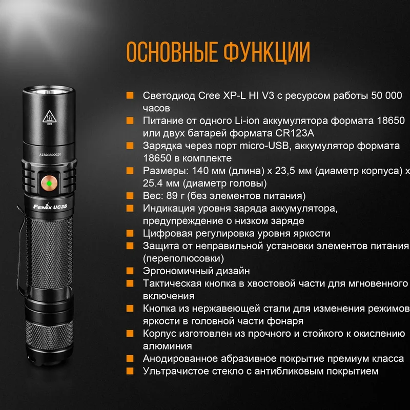 - ліхтар Fenix UC35 V2.0 витримує падіння з висоти 1 метра і тривале занурення, а також експлуатації, у воді на глибині до двох метрів (IP68);
