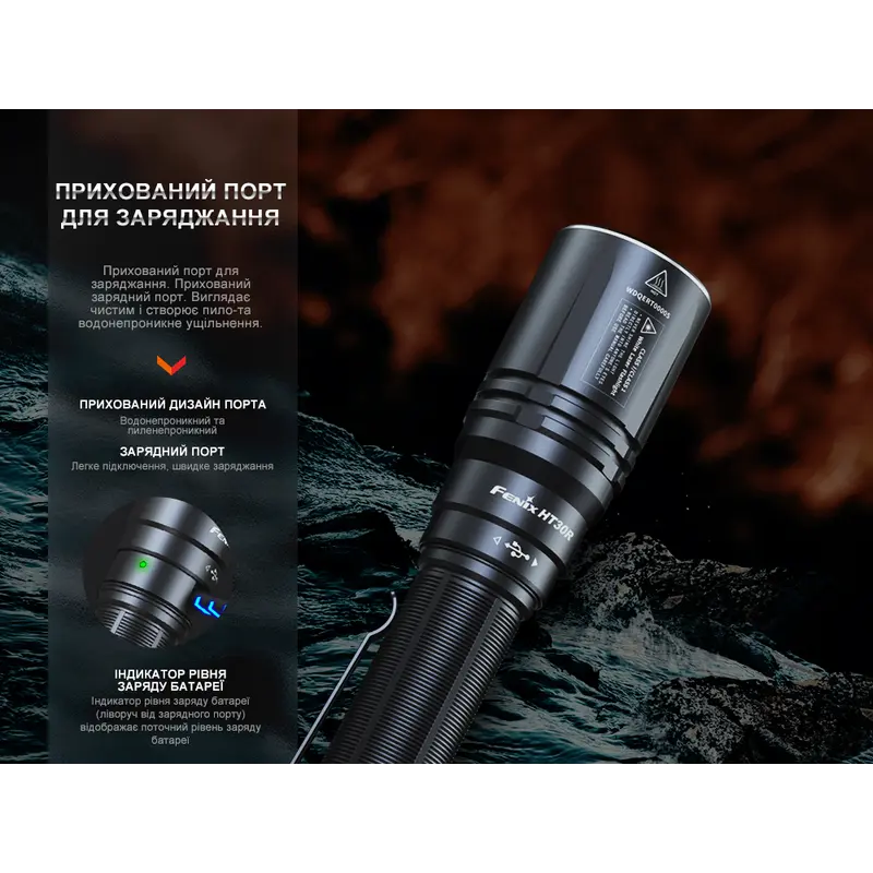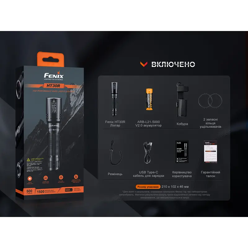 Комплектація: ліхтар моделі Fenix HT30R, літій-іонний акумулятор Fenix ARB-L21-5000 V2.0, кабель для зарядки USB Type-C, чохол, темляк, два запасні кільця ущільнювачів, керівництво до застосування, гарантія.