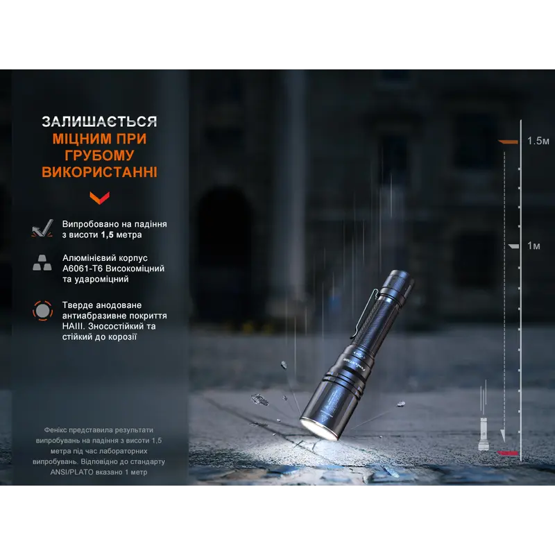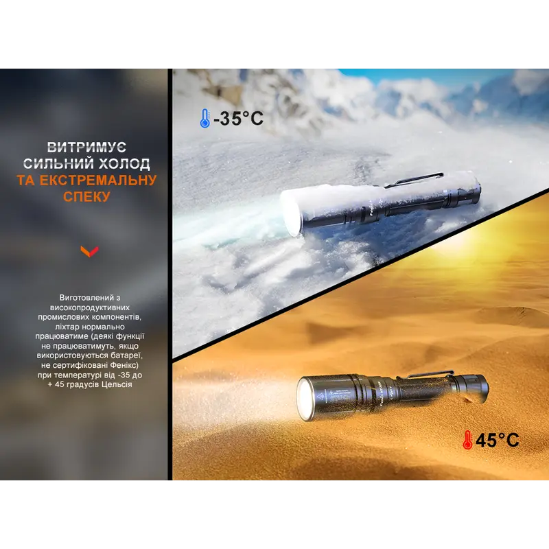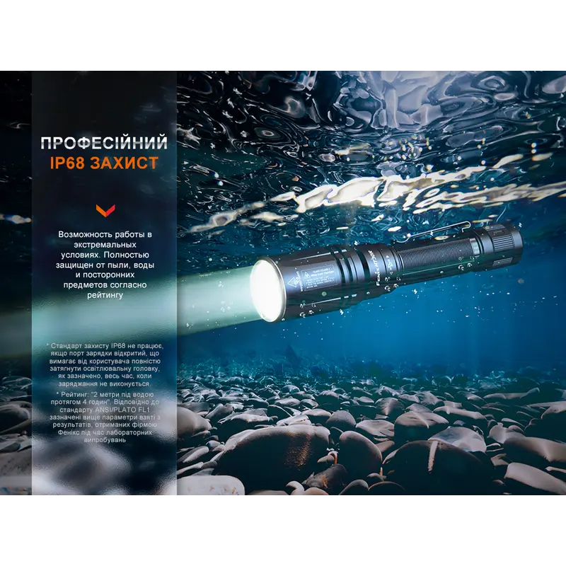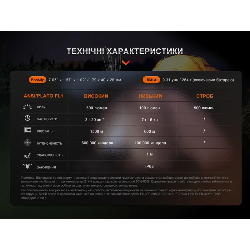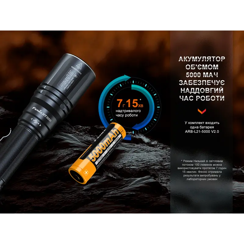 Враховуйте, що вищезазначені параметри були отримані в процесі здійснення лабораторних дослідів. Для цього використовували літій-іонний акумулятор Fenix ARB-L21-5000 V2.0 при температурі 21+-3 градуси Цельсія та вологості повітря близько 50%-80%. Фактичні параметри роботи ліхтаря можуть відрізнятися від наведених залежно від умов зовнішнього середовища та задіяного акумулятора.