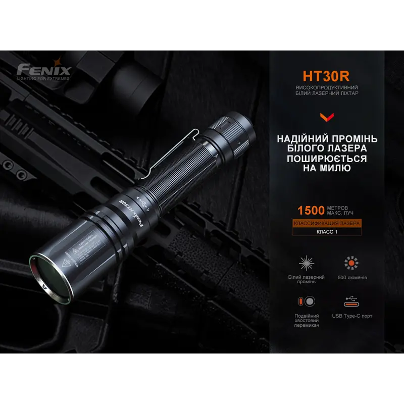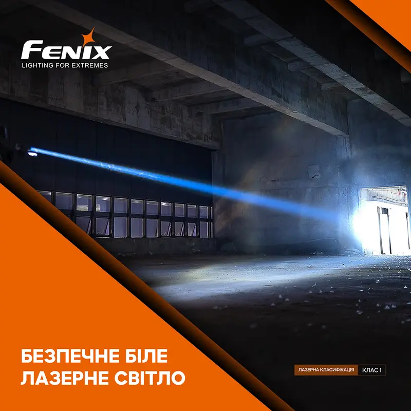 Модель Fenix HT30R є лазерним ліхтарем, який демонструє велику продуктивність та потужність. Лазер класу 1 стимулює флуоресцентний кристал для генерації білого світла широкого спектру, дозволяючи висвітлювати на відстані 1500 метрів – це понад один кілометр!
