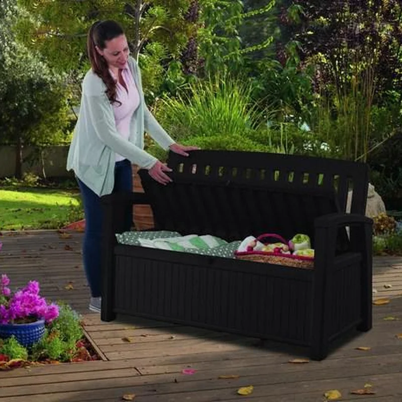 2 в 1! Лавка, поєднана з місткою скринею. Скриня PATIO BENCH - це оригінальне рішення для тих, хто хоче організувати простір балкона або саду в елегантному, але практичному стилі. Завдяки великому об'єму в скрині поміститься ковдра і подушки і навіть рекреаційне обладнання. Крім того, текстура поверхні нагадує натуральну деревину, чудово підкреслить чарівність і стиль організації простору.