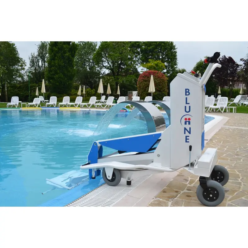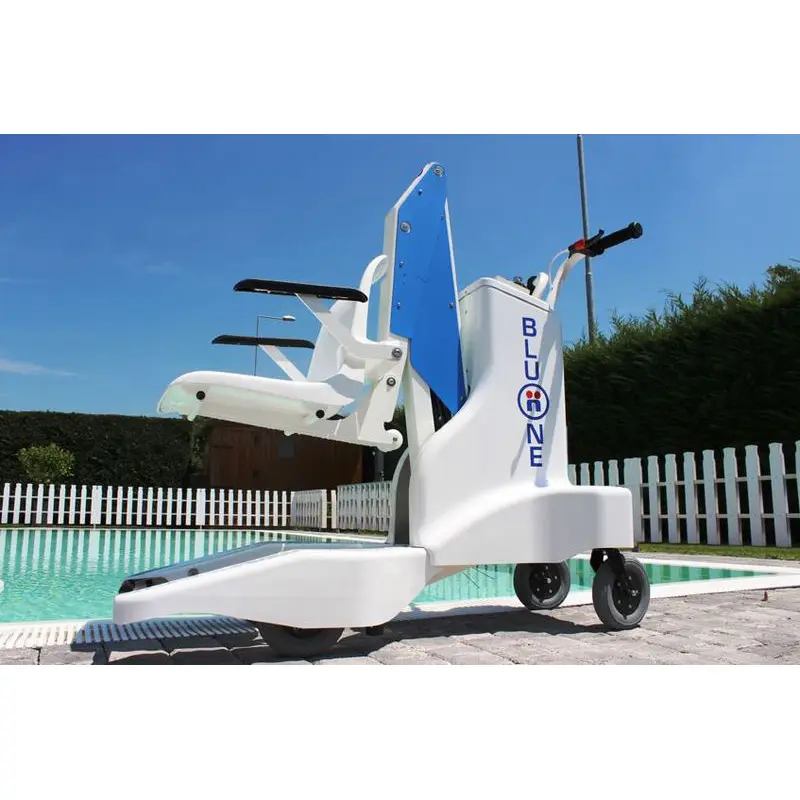 Ліфт-підйомник для інвалідів Bluone є інноваційним помічником для швидкого, безпечного і комфортного перевезення інвалідів, осіб з обмеженими руховими можливостями й тих, хто не може або боїться самостійно зайти у воду, зазнає труднощі при спуску по драбинці у воду басейну. Наприклад, люди літнього віку або особи в період відновлення після травм чи хвороб.Зручний і безпечний для особи, що перевозиться, оскільки обладнаний гумовими колесами з високою амортизуючою потужністю, різними типами утримувальних ременів, підніжкою і підголівником.Bluone не вимагає кріплення до підлоги, простий в експлуатації, маневровий. Людина розташовується на сидіння попереду і за допомогою асистента пересувається до борту басейну. Управління здійснюється за допомогою гальма і фіксатора в певній позиції. На краю басейну потрібно натиснути кнопку «Вниз», і людина поступово, плавно опуститься в басейн. Щоб підняти сидіння, потрібно натиснути кнопку «Вгору». Операція завершена, як тільки сидіння повернеться у вихідне положення.
