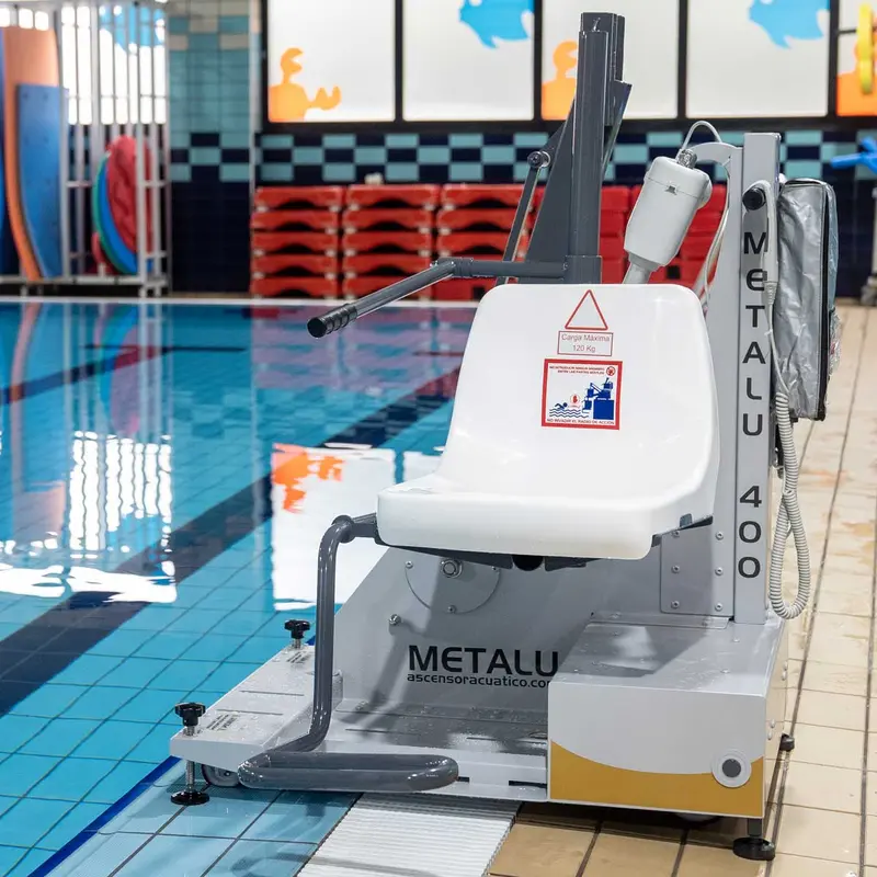 Портативний акумуляторний підйомник для інвалідів METALU 400. Не потребує встановлення, тому його можна використовувати в будь-якому місці басейну, в різних басейнах на одному корпусі або зберігати, коли він не використовується. Має поворотний важіль, поставляється з сидінням, підставкою для ніг і відкидним підлокітником. Пристрій з нержавіючої сталі AISI 316 із захистом порошковою фарбою і з електричним механізмом (акумулятор 24 В).