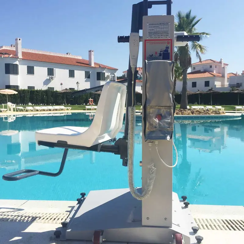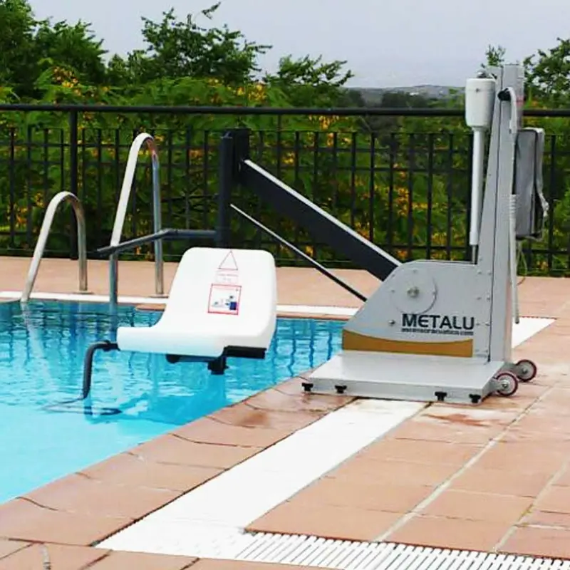 Портативний акумуляторний підйомник для інвалідів METALU 600. Не вимагає установки, просто закріпіть на краю басейну. Ліфт підходить для басейнів, де тиск води є проблемою або де вам не потрібен попередньо встановлений водозабірник. Має поворотний важіль, поставляється із сидінням, підставкою для ніг та відкидним підлокітником. Пристрій із нержавіючої сталі AISI 316 із захистом порошковою фарбою та з електричним механізмом (акумулятор 24 В).