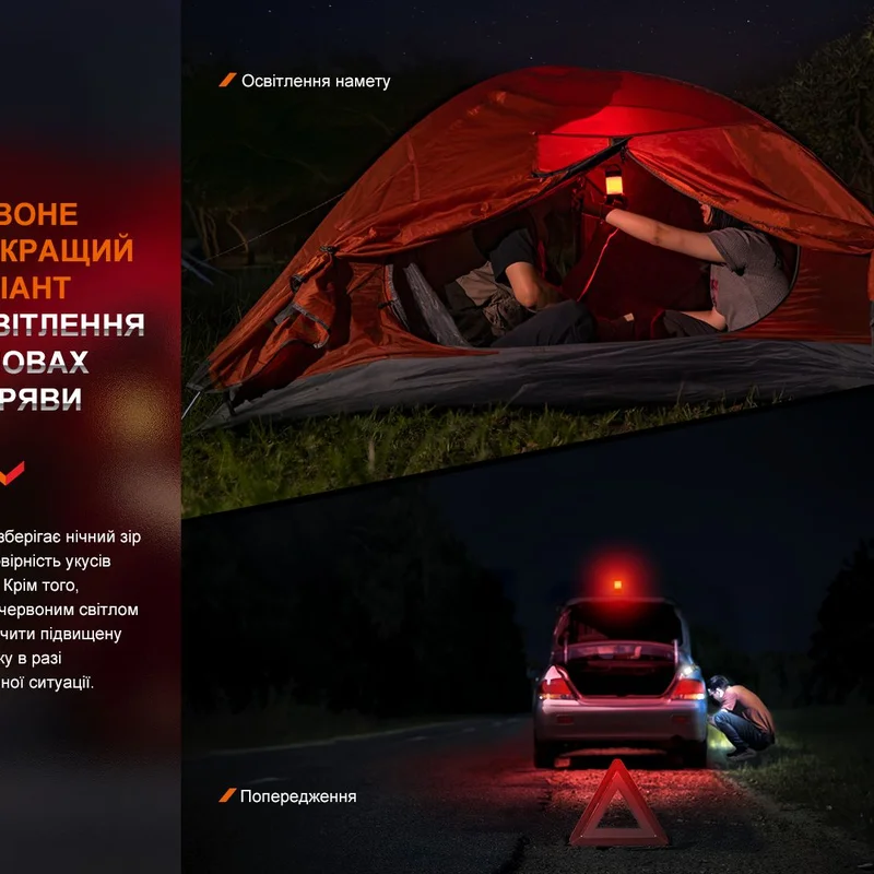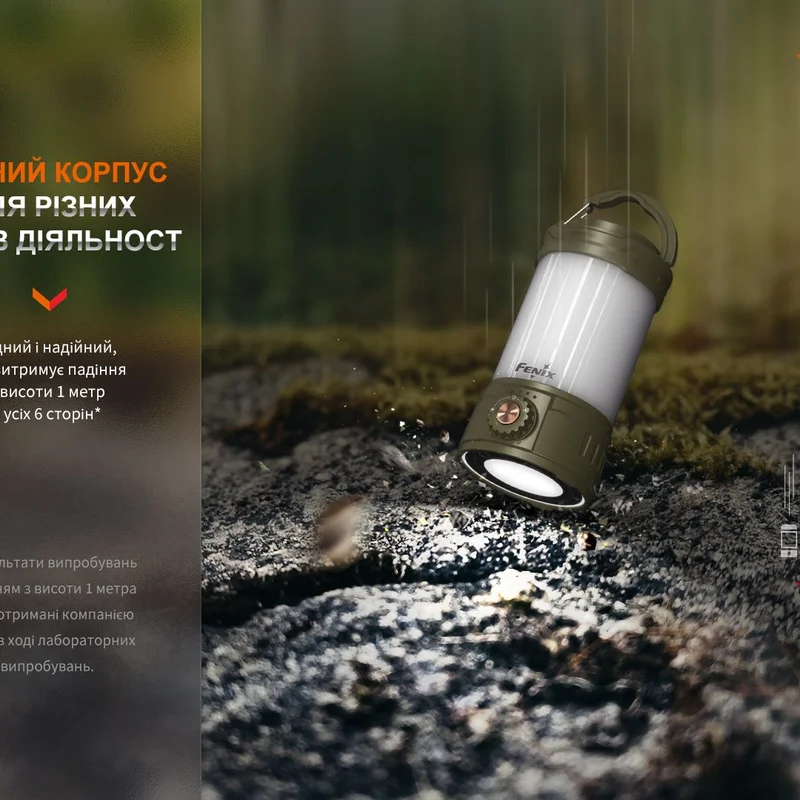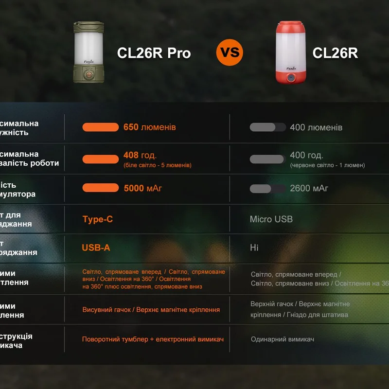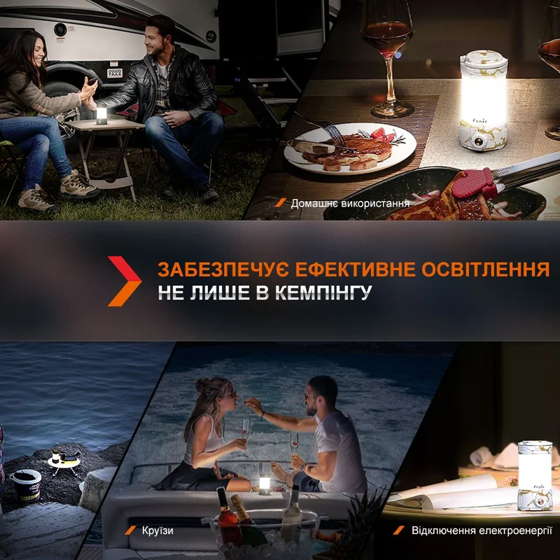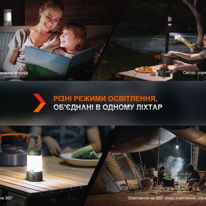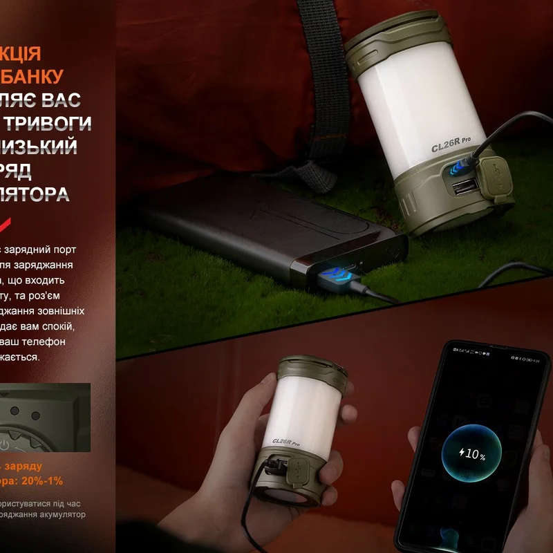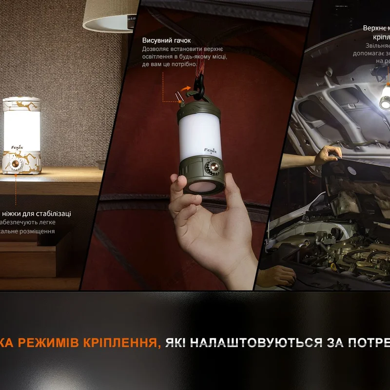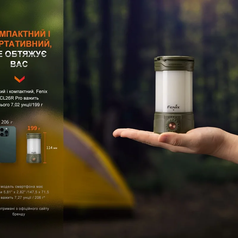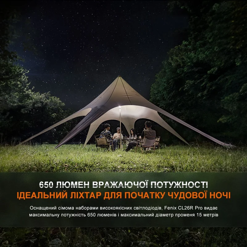 Ліхтар Fenix CL26R Pro — функціональний супутник під час відпочинку на природі. Варіативність використання моделі дозволяє облаштувати місце для відпочинку на основі особистих потреб та уподобань: ліхтар здатний світити як на 360°, так і лише вниз, а червоне світіння перетворює його на нічник, що дозволяє мандрівнику розслабитися перед відходом до сну.
