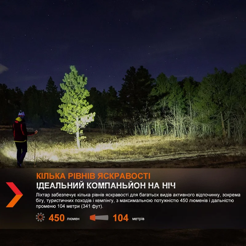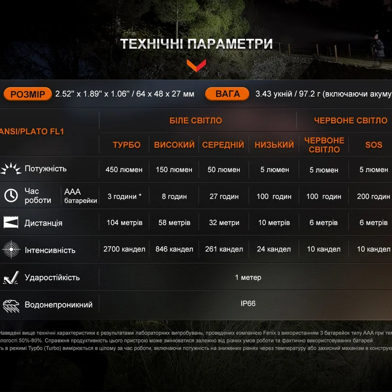 - вага ліхтаря – 97.2 г (із урахуванням елементів живлення та налобного кріплення);