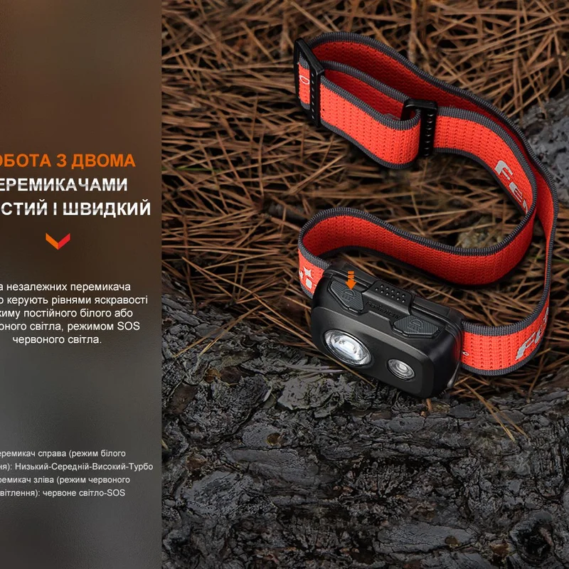 - Зміна режиму: одноразове натискання правого (для білого світла) або лівого (для червоного світла) перемикача.