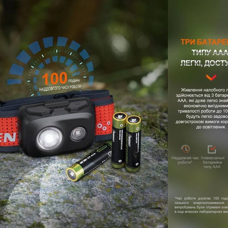 Fenix HL16 живиться від трьох найпоширеніших батарей типу ААА. Це можуть бути як лужні батареї з номінальною напругою 1.5 В, так і одноразові Ni-MH 1.2 В. Майте на увазі, що Li-ion акумулятори 10440 несумісні з даною моделлю.