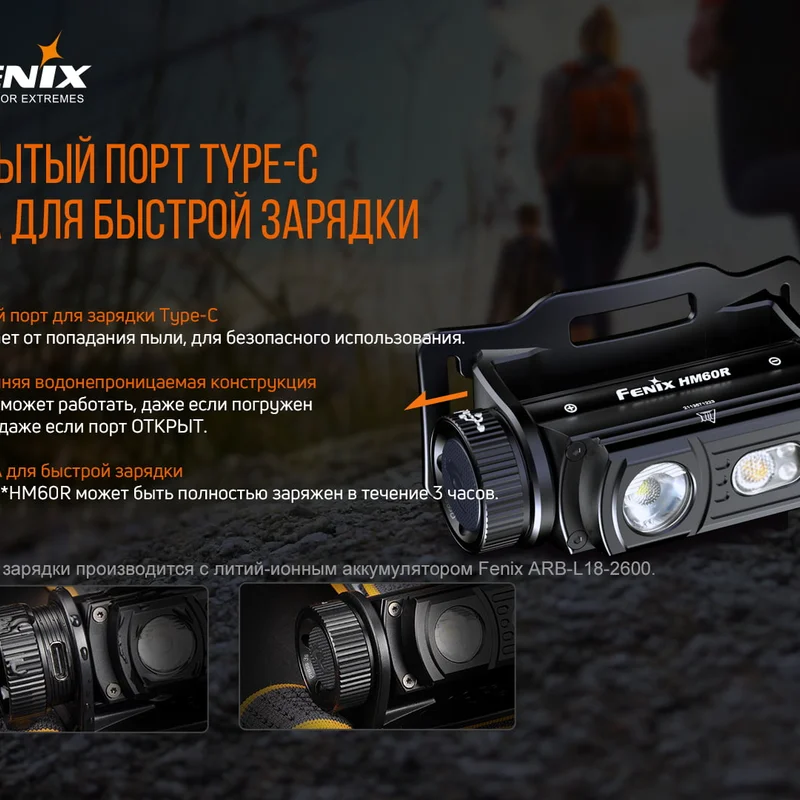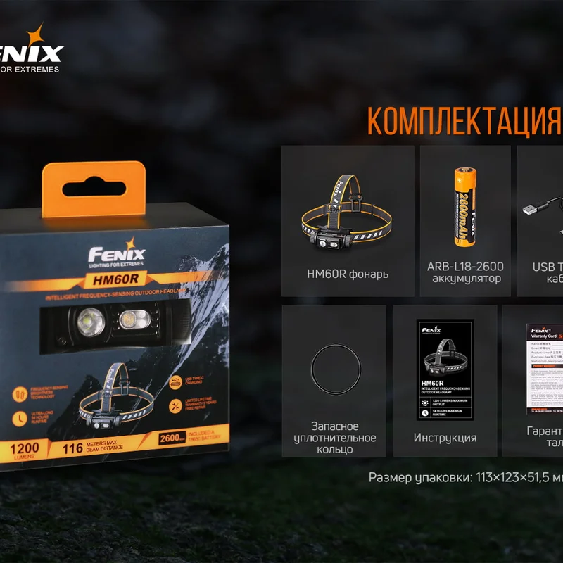 Ліхтар моделі Fenix HM60R, акумулятор Fenix ARB-L18-2600 Li-ion, кабель для зарядки USB Type-C, запасне кільце ущільнювача, керівництво користувача, талон гарантії.
