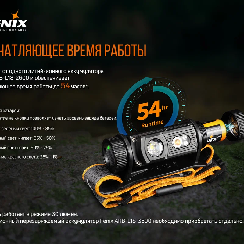 - живиться від акумулятора Fenix ARB-L18-3400 18650 Li-ion;