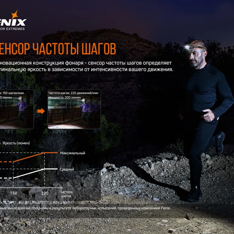 Як було вище сказано, налобний ліхтар має сенсор частоти кроку. Визначається частота кроку в середньому і максимальному режимах. В якості стандартного параметра взяли частоту 150 кроків в хвилину. При інтервалі від 150 кроків в хвилину до 220 кроків в хвилину яскравість збільшується пропорційно частоті кроку. Коли частота кроку досягає 220 кроків в хвилину, яскравість підвищується до 150% від нормальної яскравості. Коли ж частота кроку більше 220 кроків в хвилину, яскравість налічує 150% від стандартної яскравості. Якщо частота кроку менше 150 кроків в хвилину, від 150 до 80, яскравість знижується пропорційно частоті кроку. Якщо ж частота кроку дорівнює 80 ш /хв, яскравість скорочується до 70% від нормальної яскравості. При частоті кроку менше 80 ш /хв вона буде триматися на рівні 70% від звичайної яскравості. Коли буде виявлено, що частота знижується, яскравість почне поступово зменшуватися з затримкою в 10 секунд.