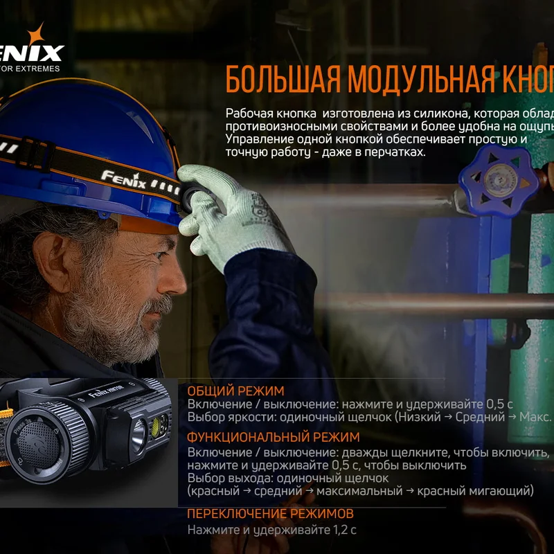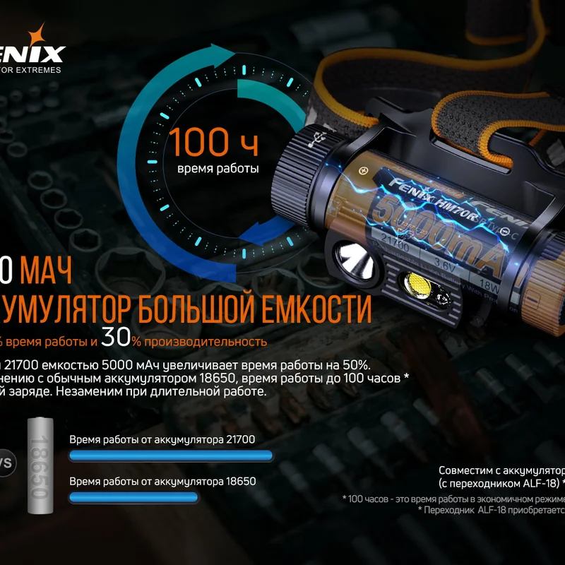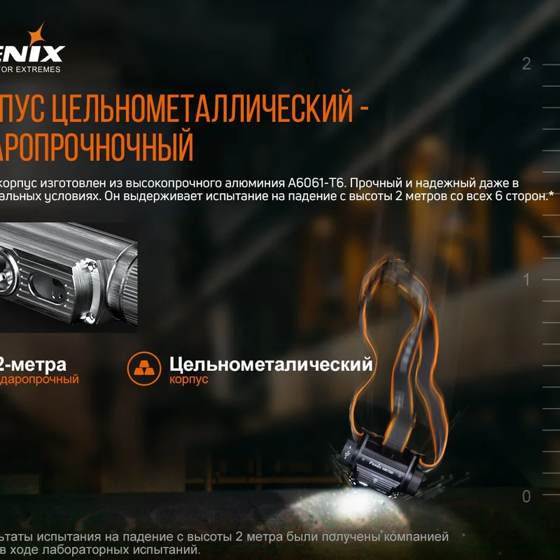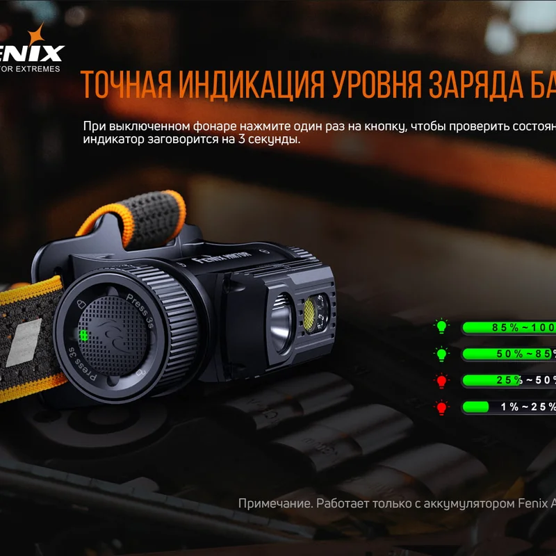 * Слід згадати, що такі параметри світіння налобника вдалося отримати в ході проведення лабораторних випробувань. Де були наступні умови: температура повітря досягала 21 + -3 градуси Цельсія, вологість була близько 50% -80%. Використовували акумулятор Fenix ARB-L21 - 5000 літій-іонний. Реальні показники світіння ліхтаря можуть відрізнятися в залежності від того, які елементи живлення застосовуються, а також від умов середовища.