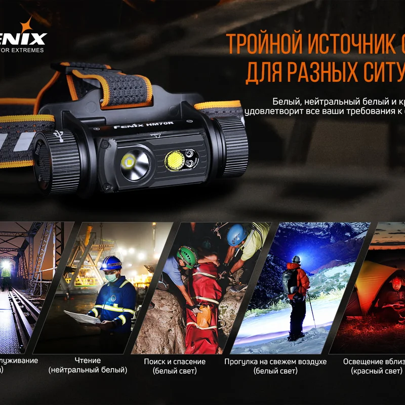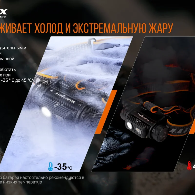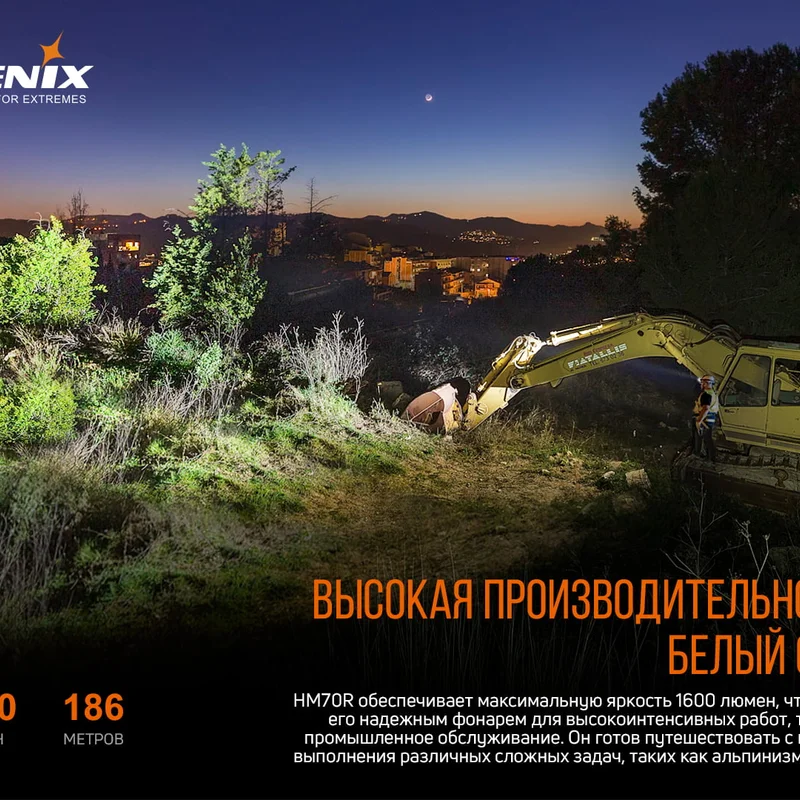 Налобник Fenix HM70R-суцільнометалевий ліхтар, який дає далеке і широкосмугове освітлення з найбільшим світловим потоком 1600 люменів і максимальною тривалістю світіння до 100 годин. Відстань дії променя досягає 186 метрів в найбільшому режимі.