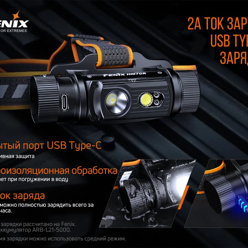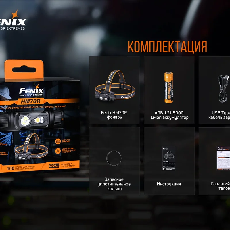 Ліхтар моделі Fenix HM70R, акумулятор Fenix ARB-L21-5000 літій-іонний, кабель зарядний USB Type-C, запасне кільце ущільнювача, інструкція, талон гарантії.