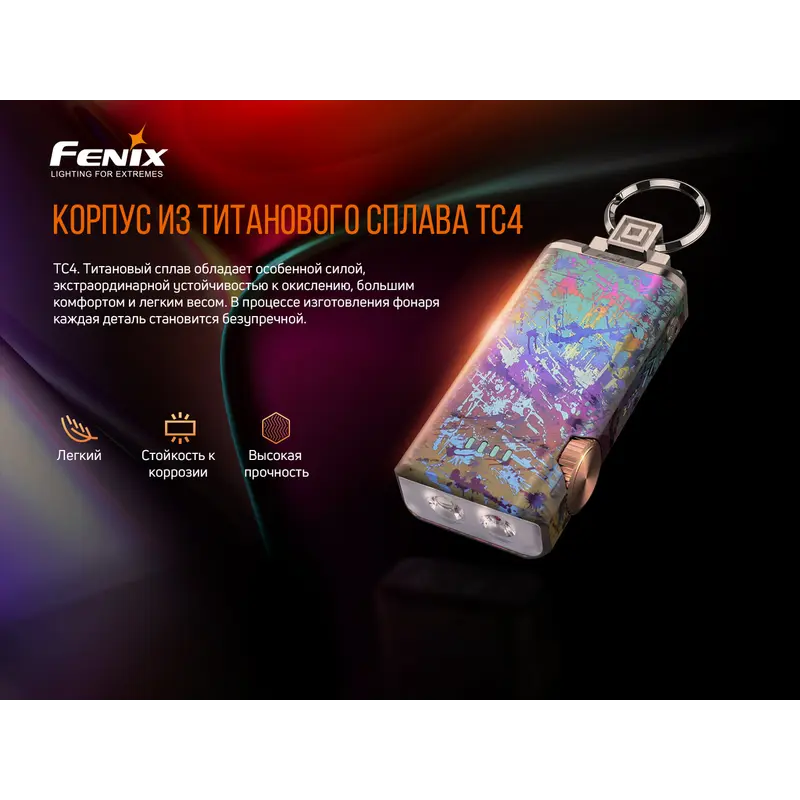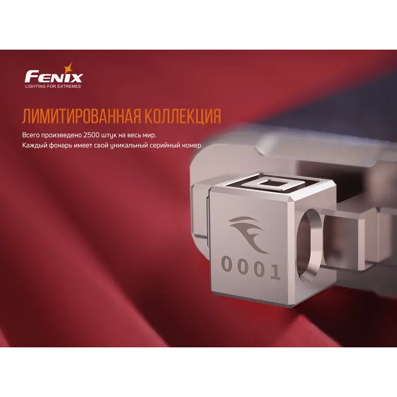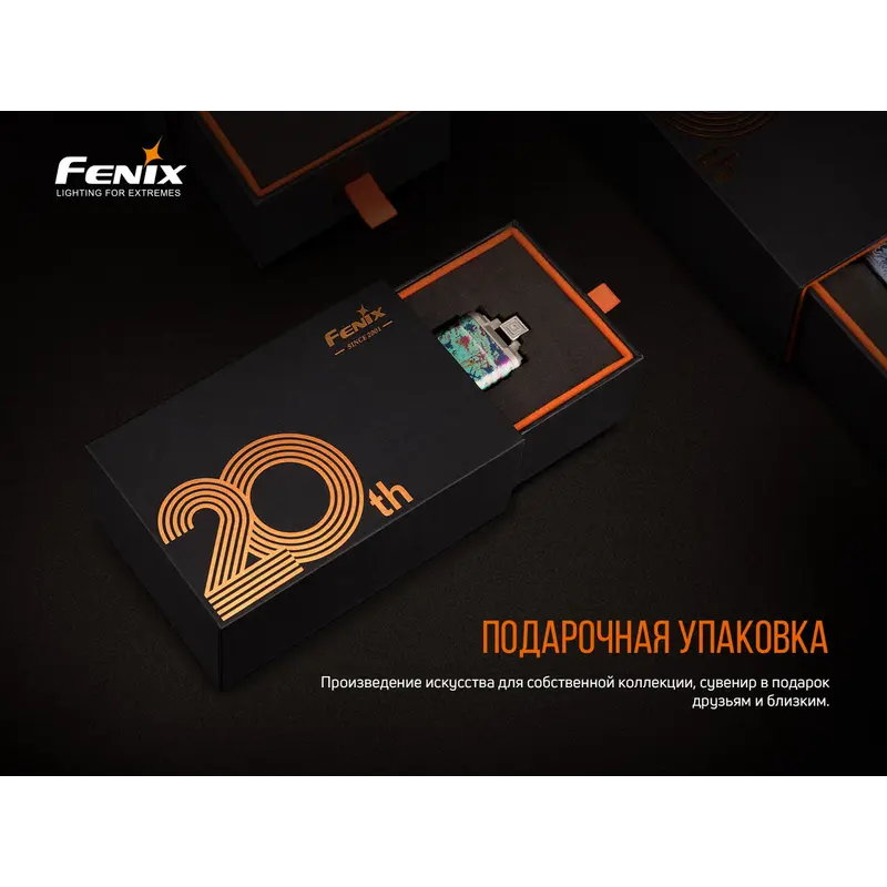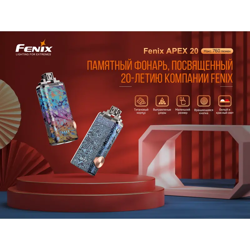 Модель ліхтаря Fenix APEX 20 є спеціальною лімітованою серією ліхтарів. Цей ліхтар випущений з нагоди 20-річного ювілею компанії-виробника. Унікальний ліхтар виконаний зі сплаву титану TC4 і нержавіючої сталі з характерною текстурою. Модель відноситься до категорії EDC – для щоденного застосування. Максимальний світловий потік досягає 760 люменів, а відстань дії променя становить 86 метрів. Освітлення дають два діода: білий світлодіод Cree XP-L HI V2 і червоний світлодіод Cree XQ-E з терміном служби 50 000 годин.