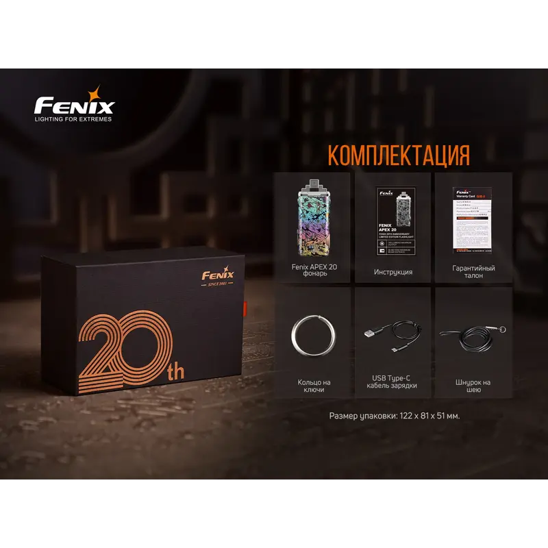 Модель ліхтаря Fenix APEX 20, кабель для зарядки USB Type-C, ланцюжок для ключів, темляк, інструкція до застосування, талон гарантії.