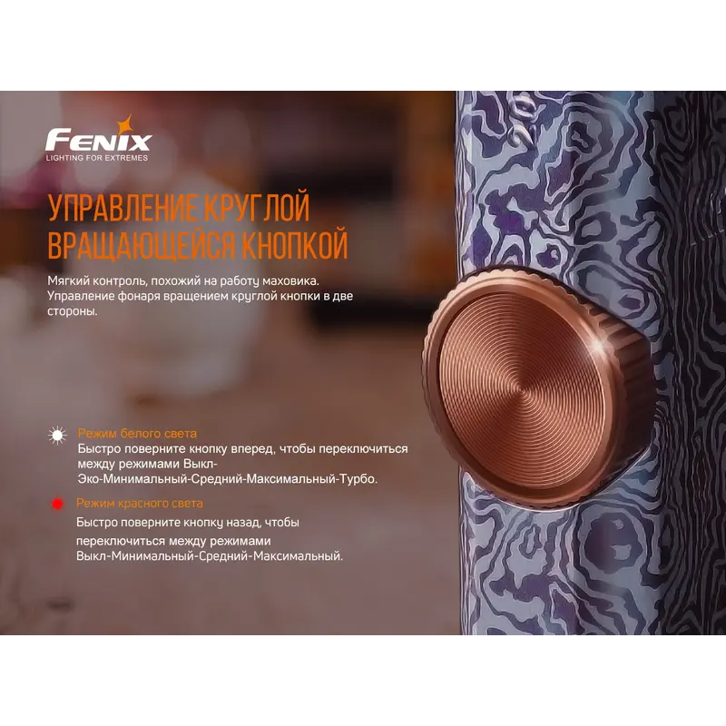 Вибір рівня: в режимі білого освітлення швидко поверніть перемикач вперед, це дасть можливість циклічно переміщатися між режимами OFF→Eco→Low→Med→High→Turbo (переміщення діє і в зворотному напрямку). У режимі червоного освітлення: швидко поверніть кнопку назад, щоб вибрати OFF→ Low→Med→High.