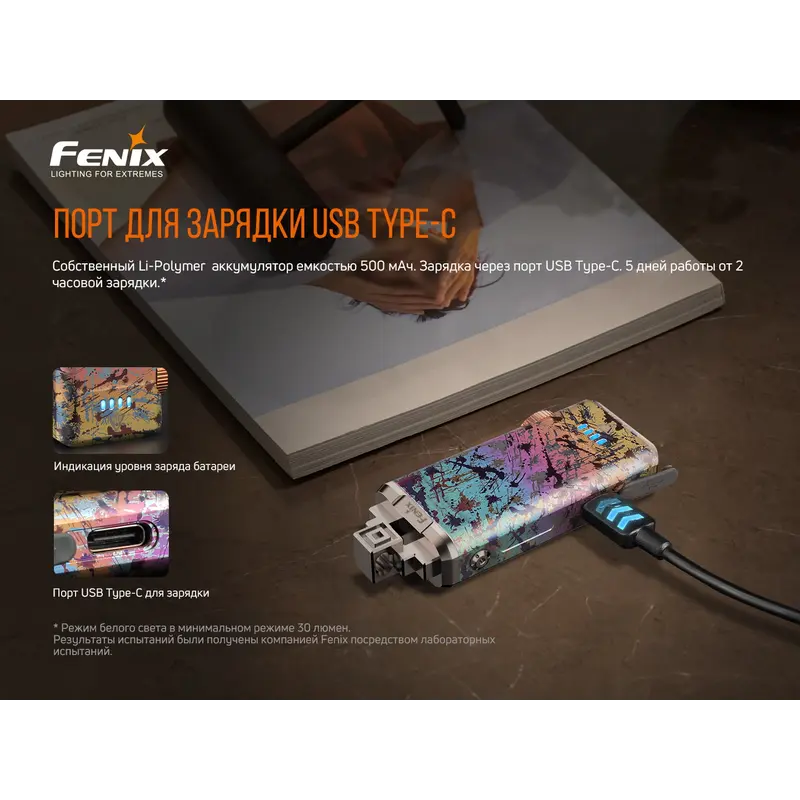 Fenix APEX 20 представлений в двох варіантах кольору: Синій і райдужний мікс. За харчування відповідає вбудований літій-полімерний акумулятор ємністю в 500 маг. Заряджається ліхтарик через порт USB Type-C. управляється модель бічним круглим обертовим перемикачем. Тут передбачена функція індикації рівня заряду акумулятора при завантаженні і попередження про низьку напругу.