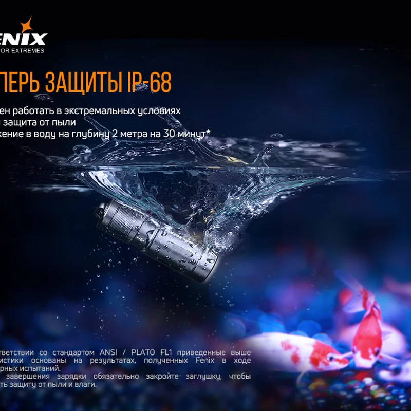 Розміри Fenix E02R складають 48*15*14 міліметрів. Вага дорівнює 15 грамам. Витримує падіння з висоти одного метра. Стандарт захисту від води і пилу – IP68.
