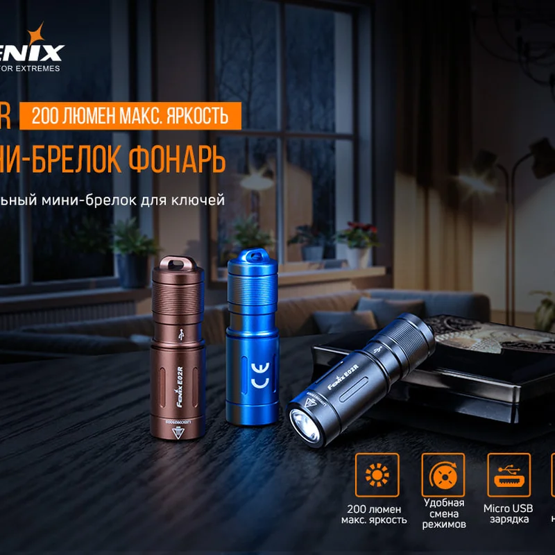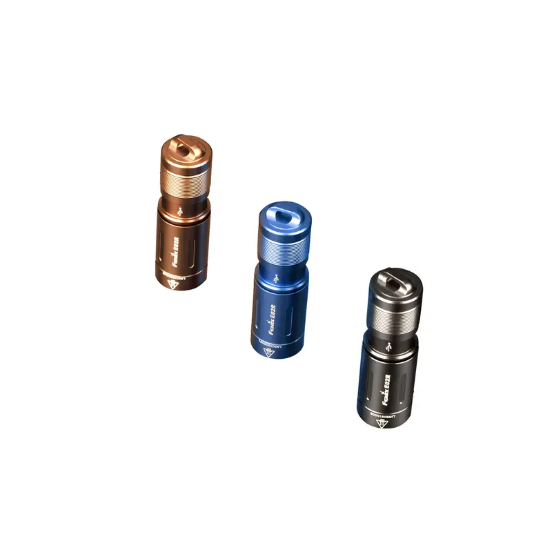 Модель Fenix E02R являє собою акумуляторний прилад, який зробить користь в якості брелока на ключі. Одне з основних переваг ліхтаря – його компактні розміри. Важить вона не більше 15 грам. Такий мініатюрний ліхтарик дає світловий потік в 200 люменів, а відстань поширення променя досягає 49 метрів. Функціонує з вбудованим акумулятором ємністю 120 міліампер-годин. Літій-полімерний акумулятор забезпечує роботу ліхтарика, а освітлення виходить за рахунок застосування світлодіода Cree XP-G2 S3. Освітлення – білого кольору. Передбачений порт micro-USB для підзарядки акумулятора.Ліхтар оснащується лінзою з дзеркальним напиленням, що гарантує високу ефективність освітлення. Fenix E02R виготовлений з міцного матеріалу, яким є алюміній марки А6061-Т6. Він користувачам пропонується в трьох різних дизайнах. Є на вибір варіанти з чорним, синім, бронзовим кольорами корпусу.