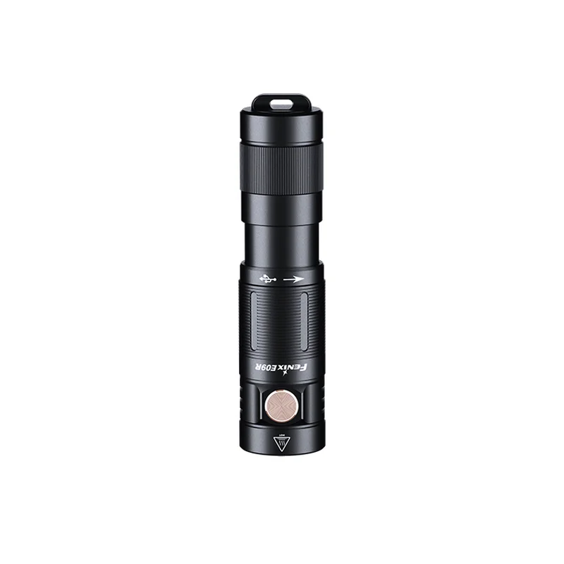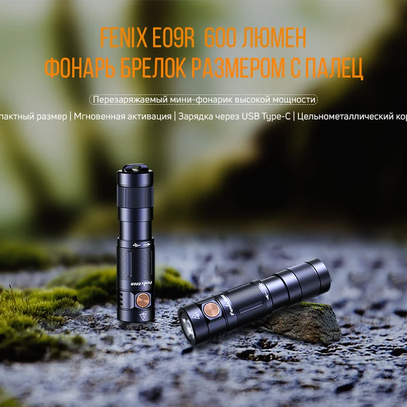 Модель Fenix E09R являє собою невеликий і легкий брелок, який дає освітлення максимальною яскравістю до 600 люменів. При цьому далекобійність променя досягає 124 метрів. Функціонує ліхтар на світлодіоді Luminus SST20, а елементом живлення служить вбудований Li-Po акумулятор 800 маг. Термін служби такого діода досягає 50 тисяч годин.