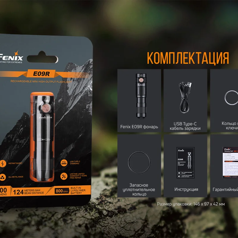 Комплектація: ліхтар моделі Fenix E09R, кабель для зарядки USB Type-C, кільце на ключі, запасне кільце ущільнювача, інструкція до застосування, гарантійний талон.