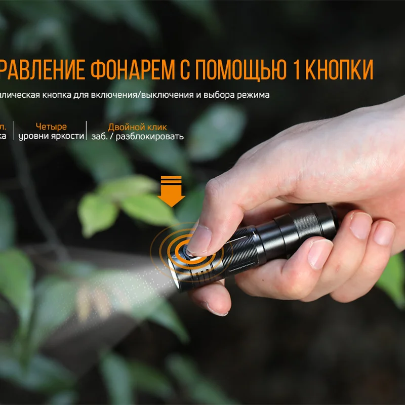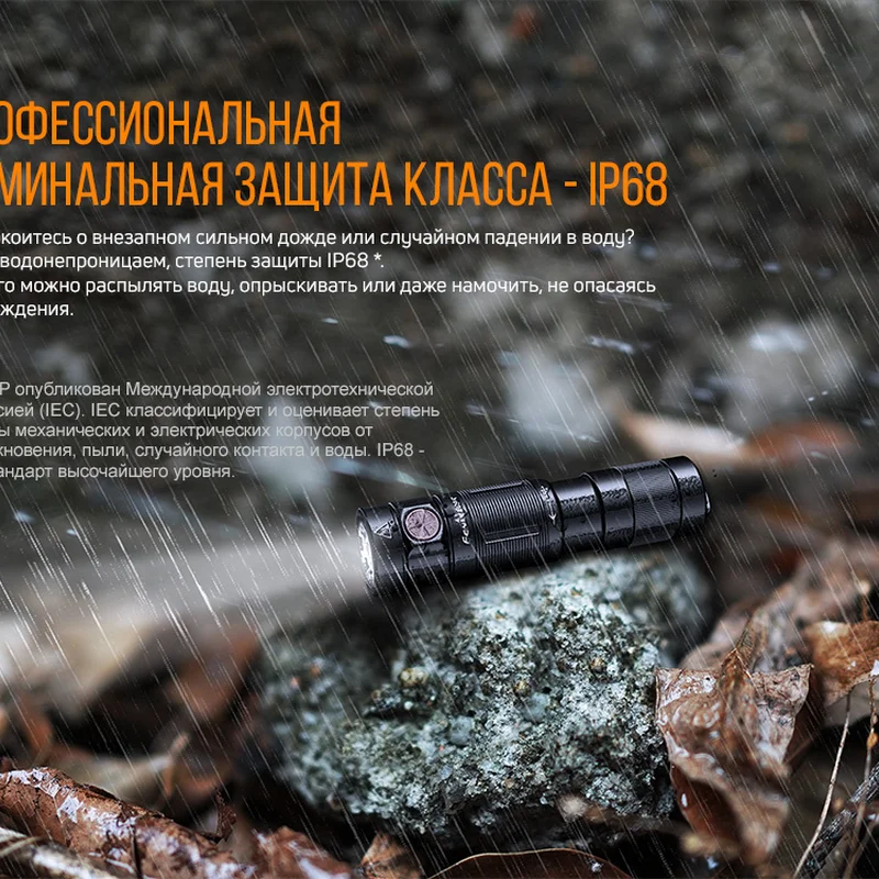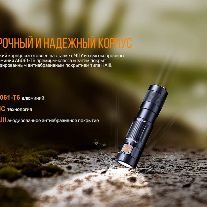 Корпус ліхтаря зробили з міцного і надійного алюмінію A6061-T6. Поверхня оброблена преміальним жорстким анодуванням, стійким до абразивів. Стандарт захисту від пилу і води: IP68. Модель легко переносить падіння з висоти до одного метра. Розміри складають 79*19,3*18,4 вага дорівнює 45 грамам.