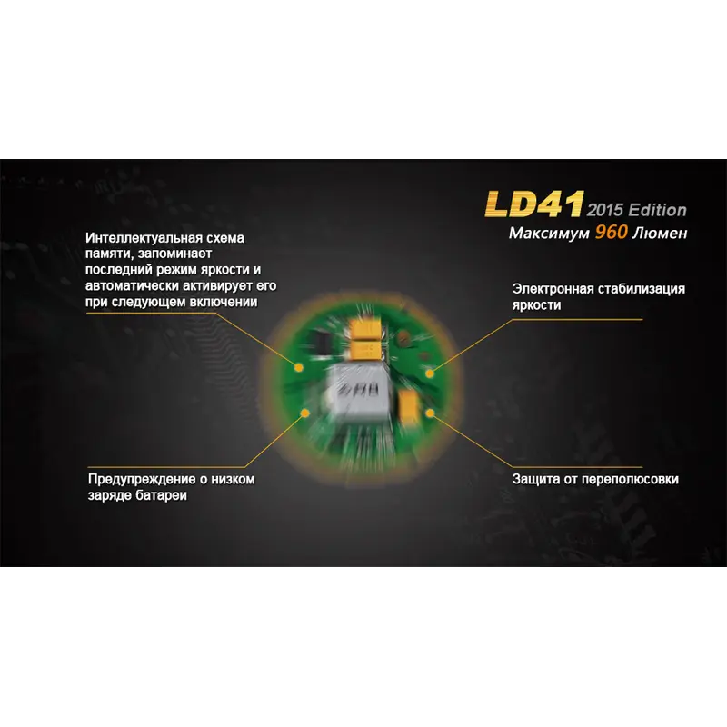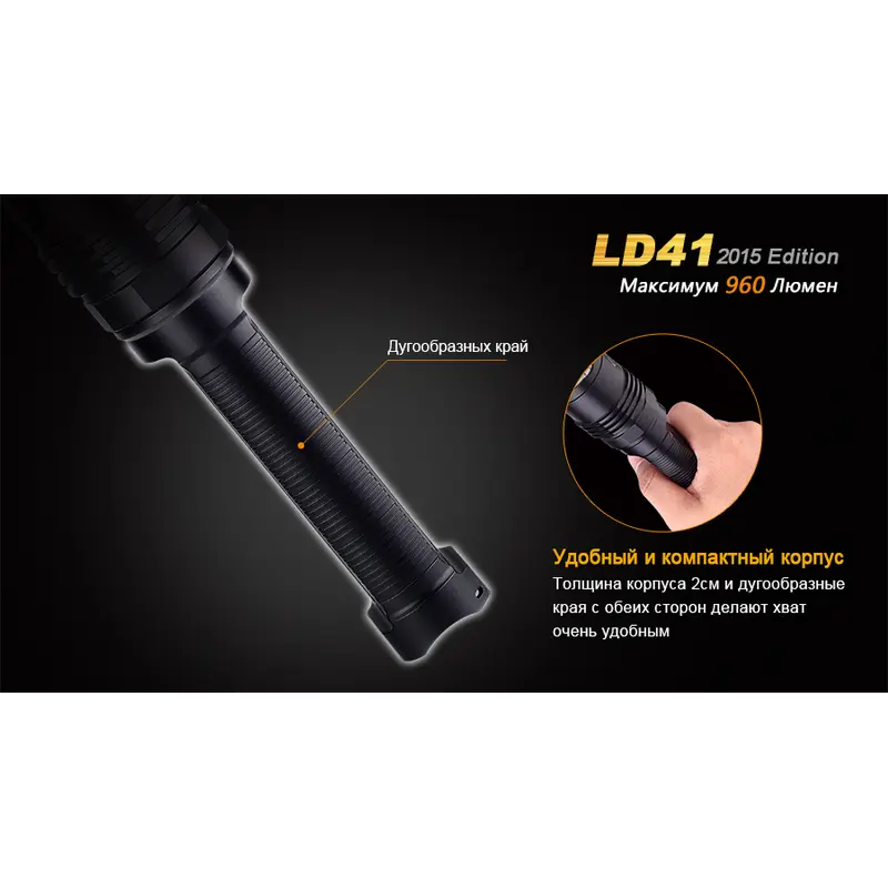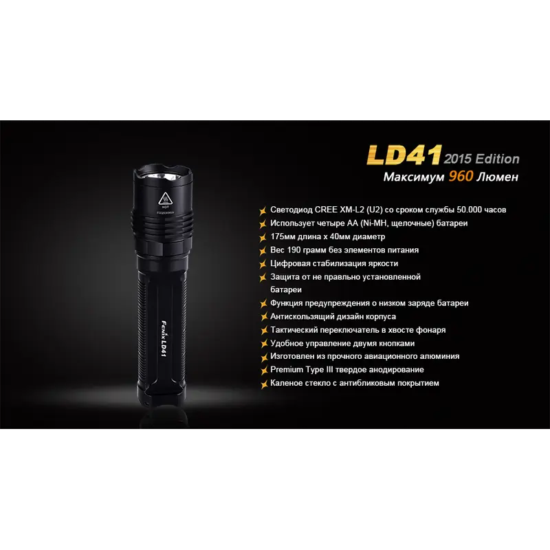 Модель Fenix LD41 дуже практична у використанні. Ліхтар легко управляється за допомогою 2 торцевих кнопок, має високий рівень захисту всіх внутрішніх механізмів. Зокрема, його електросхема не схильна короткого замикання внаслідок неправильної полярності елементів живлення. Постійний рівень яскравості ліхтаря підтримує система цифрової стабілізації.