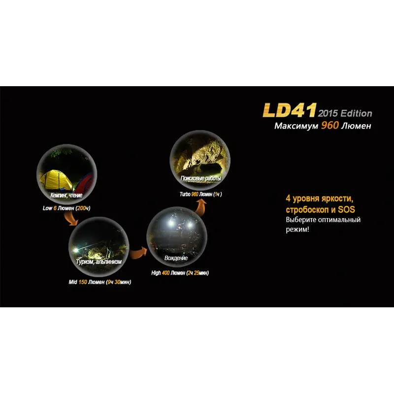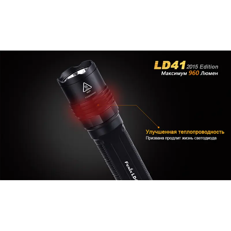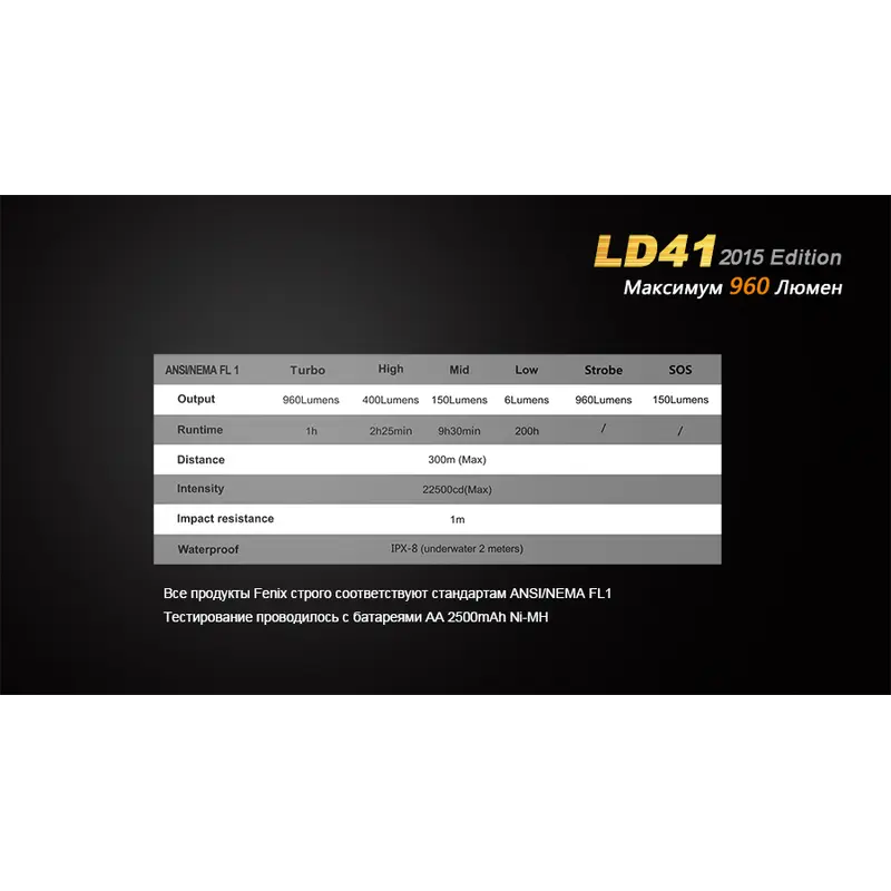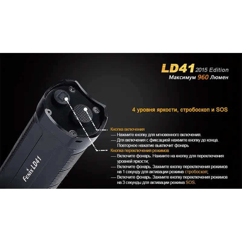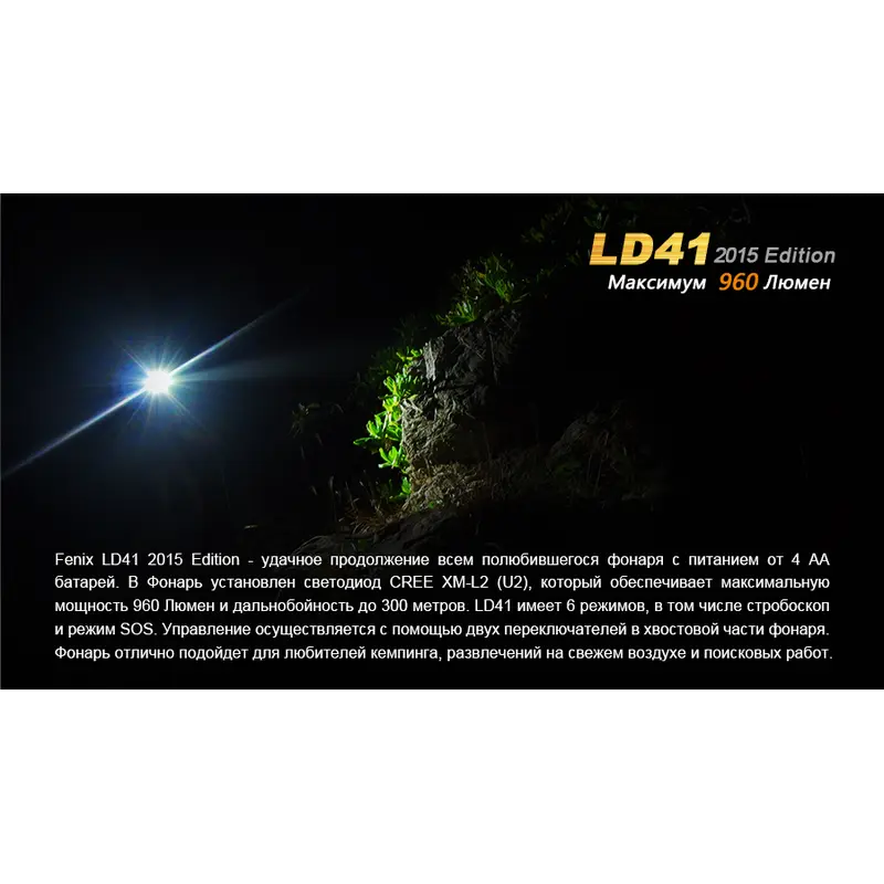 В удосконаленій моделі ліхтарі Fenix LD41 використовується світлодіод CREE XM-L2 (U2). Його робочий ресурс становить 50 000 годин, а верхня межа яскравості досягає значення 680 люмен. На базі цього світлодіода ліхтар працює у 6 режимах. Максимальна дистанція освітлення для нього становить 270 м. Перерахуємо характеристики роботи освітлювального пристрою в кожному з режимів: