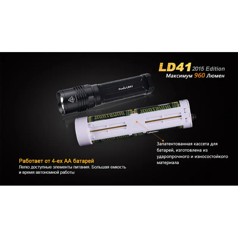 Батарейний блок ліхтарі Fenix LD41 вміщує 4 стандартні пальчикові батареї. Вони розташовуються в спеціальній пластиковій касеті в 2 ряди. Щоб ліхтар працював з заявленими виробниками характеристиками яскравості і часу, рекомендується використовувати Ni-MH акумулятори з номінальною потужністю 1,2 V. Крім того, освітлювальний пристрій буде працювати в штатному режимі з якісними літієвими або лужними батареями з номінальною напругою 1,5 V. Ні в якому разі не можна використовувати одночасно елементи живлення різних типів.