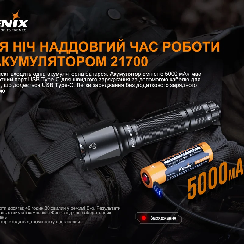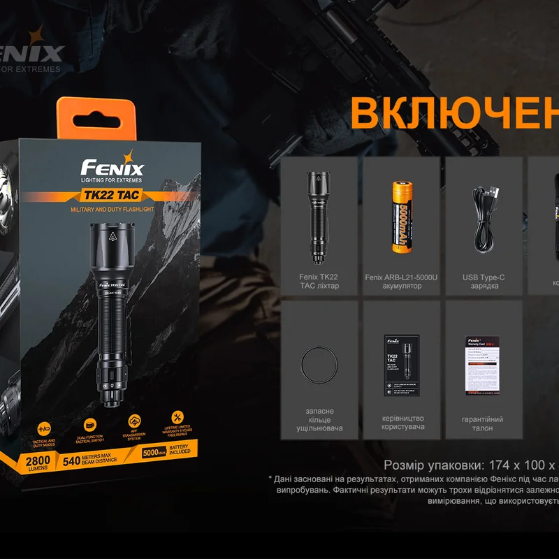 Комплектація: модель ліхтаря Fenix TK22TAC, акумулятор Fenix ARB-L21-5000U літій-іонний, кабель для заряджання USB Type-C, чохол, запасне кільце ущільнювача, інструкція, талон гарантії.