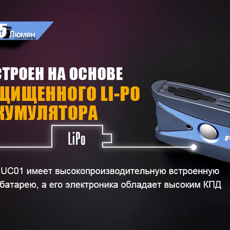Ліхтар Fenix UC01 працює на індивідуальному літій-полімерному акумуляторі, вбудований в корпус. Його заряду вистачить на 1 годину 20 хвилин освітлення в максимальному режимі, 3 години — в середньому 50 годин — в мінімальному. Відстежувати поточний рівень зарядки пропонується з допомогою індикатора. Для повністю зарядженої батареї він буде світитися зеленим, для розрідженого наполовину червоним. Якщо ж заряду залишиться менше 20%, червона лампочка індикатора буде блимати.