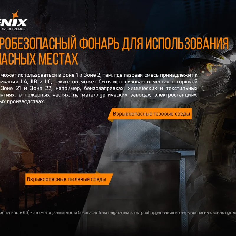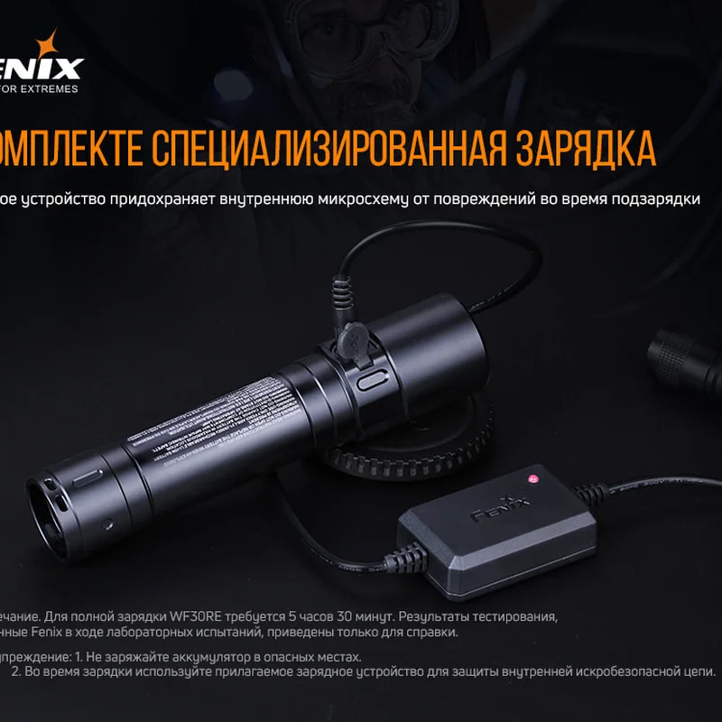 Модель Fenix WF30RE є вибухозахищеним варіантом ліхтаря, використовувати який оптимально скрізь, де існує загроза вибуху. Виняток становлять підземні шахти. Ліхтар протестували, і він отримав сертифікати, такі як IECEx, ATEX, CSA, NEPSI. Призначений для застосування в зоні 1 і зоні 2, де газова суміш відноситься до класифікації IIA, IIB і IIC. Також надасть користь в місцях з горючим пилом. Це можуть бути Зона 21 і Зона 22, а конкретніше: заправні станції, хімічні та текстильні підприємства, пожежні частини, металургійні заводи та інші.