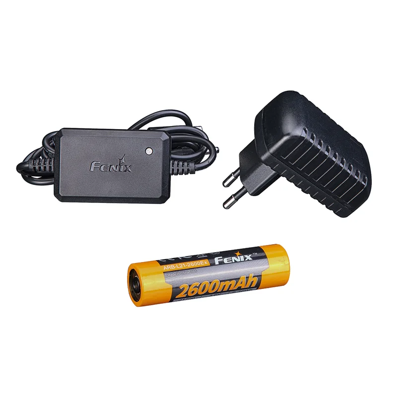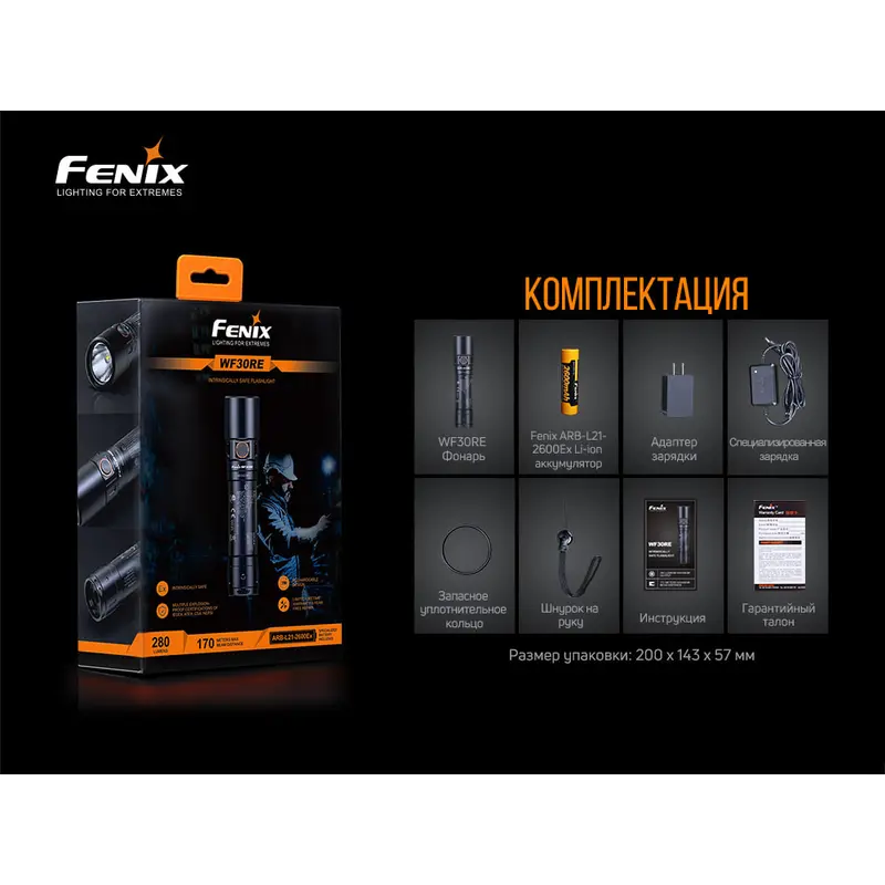 Модель ліхтаря Fenix WF30RE, акумулятор Fenix ARB-L21-2600ex Li-ion, адаптер для зарядки, захисний пристрій для зарядки, запасне кільце ущільнювача, ремінець, інструкція до застосування, талон гарантії.