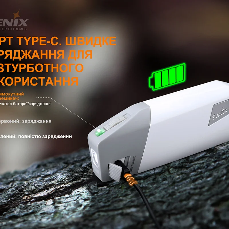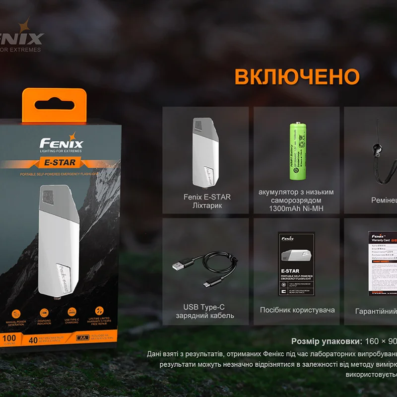 Комплектація: модель ліхтаря Fenix E-STAR, Акумулятор Ni - MH 1300mah з низьким саморозрядом, кабель для зарядки USB Type-C, темляк, інструкція користувача, талон гарантії.