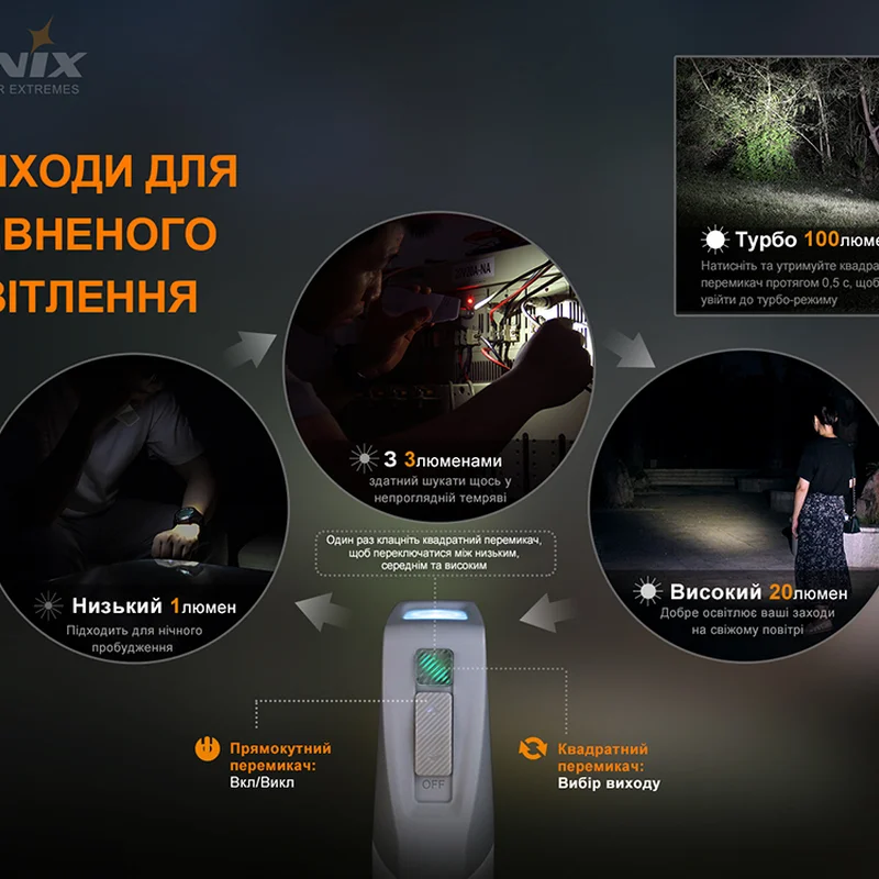 Зніміть ізоляційну прокладку з кришки акумуляторного відсіку для першого застосування. Посуньте прямокутний перемикач вперед, щоб включити освітлення, посуньте його назад, щоб погасити світло. Для вибору режиму освітлення: при включеному світлі натисніть один раз на квадратний перемикач – це дозволить переміщатися між рівнями Low – Med – High. Натисніть і потримайте квадратний перемикач півсекунди з метою активації режиму Турбо. Якщо відпустити-освітлення повернеться до раніше застосовувався режиму.