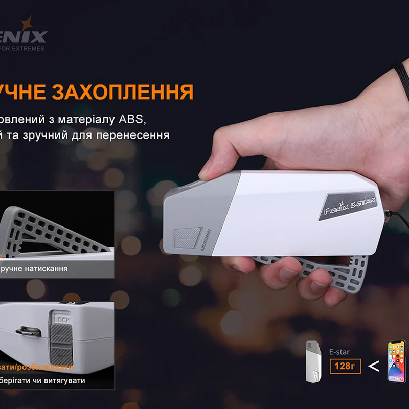 Ліхтар моделі Fenix E-STAR є портативним приладом з автономним живленням для екстрених випадків, в тому числі для районів з відсутністю стабільного Електропостачання і районів, постраждалих від стихійних лих.