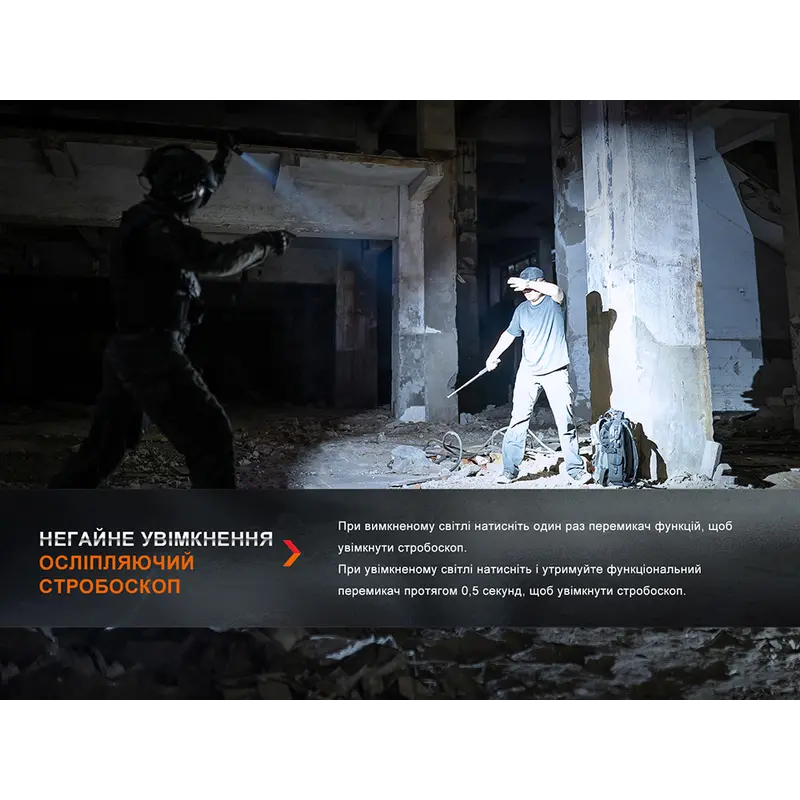 - Активація стробоскопа у постійному режимі: затискання функціонального перемикача протягом 0.5 секунд. У разі повторного натискання активується режим постійного світла.