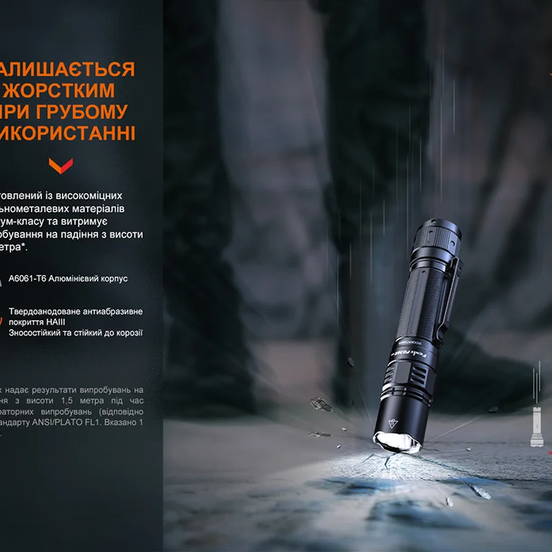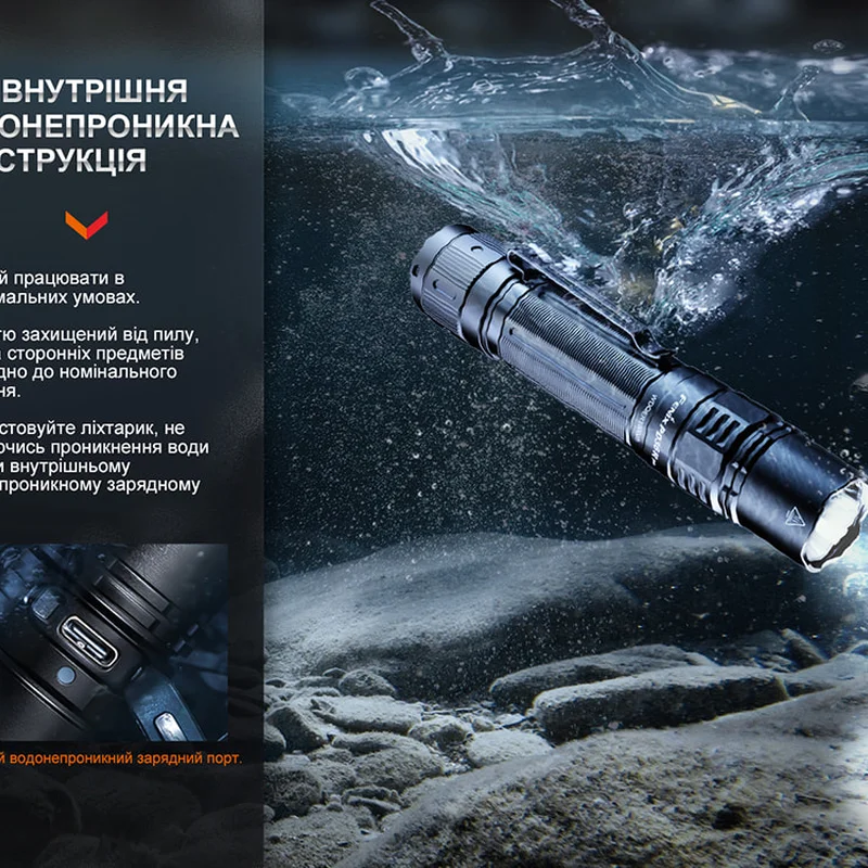 Корпус виготовлений із зносостійкого алюмінієвого сплаву А6061-Т6, який відрізняється міцністю та стійкістю до механічних впливів. Метал не деформується під час ударів та гарантує захист внутрішньої електроніки у разі падіння ліхтаря з висоти близько 1.5 метрів. Корпус повністю герметичний – про це говорить клас вологозахисту IP68, що дозволяє багаторазово занурювати пристрій під воду без загрози для його працездатності.