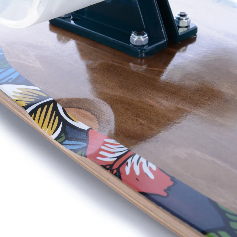 Выполнена дека из прочного канадского клена, самого лучшего материала который встречается в досках. Он прочный и имеет минимальную гибкость, а зернистое покрытие смонтированное наверх позволяет хорошо стоять на ногах без риска соскальзывания.