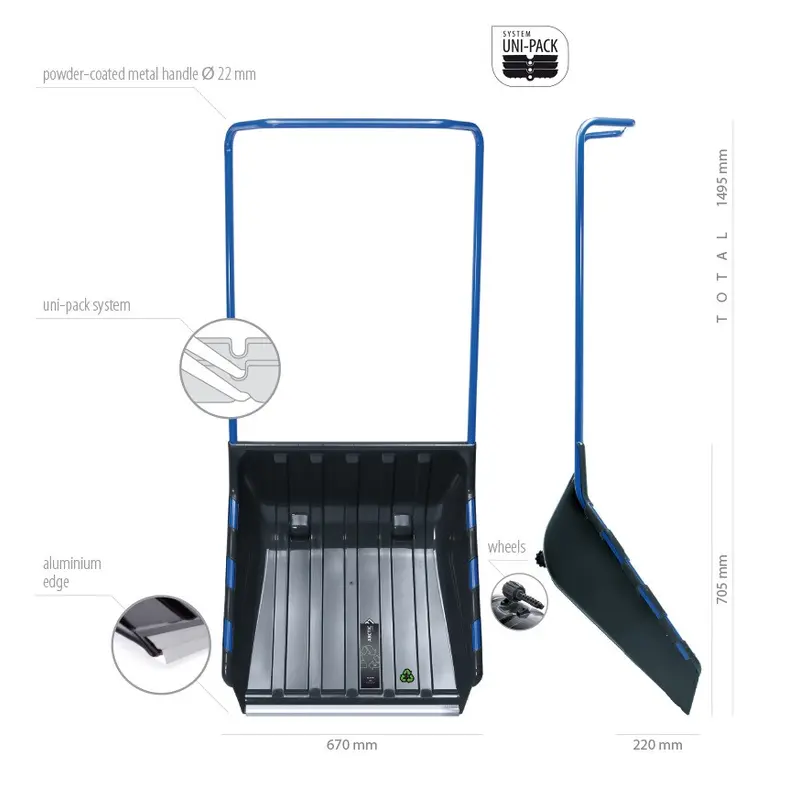 Лопата-скрепер Prosperplast Arctic L Eco — це міцний та якісний інструмент із широким глибоким ковшем , що забезпечує швидке та зручне прибирання снігу навіть на великих площах. Механізм роботи виробу простий та ефективний — завдяки коліщатам, що легко монтуються у конструкцію ковша, масивні об'єми снігу комфортно переміщати на великі відстані, варто лише штовхати лопату перед собою при ходьбі. У такий спосіб, економляться не лише час, а й сили користувача, адже не потрібно щоразу відкидати сніг ковшем, як би це було із класичною лопатою.Ківш виготовлений з міцного морозостійкого пластику та, окрім надійних коліщаток, обладнаний алюмінієвим кантом, тому виріб може впоратися навіть із замерзлим і мокрим снігом. Ергономічна форма металевої профільованої ручки гарантує стабільність і високу міцність, а її ширина помістить одночасно дві людини.Лопата-ківш скрепер з коліщатами Arctic L Eco ідеально підходить для прибирання снігу з великих територій промислових об'єктів, автостоянок, заправних станцій, офісів і громадських будівель, а також під'їзних шляхів і дворів, де необхідне регулярне очищення снігу.Інвентар для прибирання снігу польського бренду Prosperplast відрізняється високою якістю, міцністю, довговічністю та екологічністю.