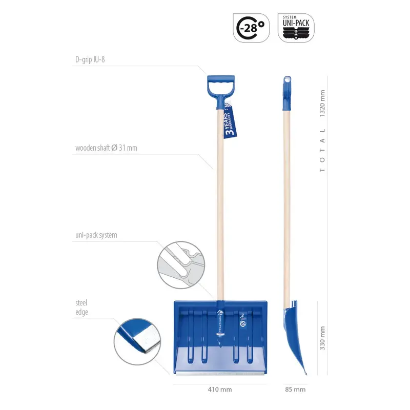 Лопата снігоприбриральна Prosperplast Alpin 1A відзначається невеликою вагою виробу, міцною рукояткою та ковшем, виконаним зі спеціального морозостійкого пластику (до -28°C), що має алюмінієву окантовку нижньої частини. Ці переваги виробу дозволяють працювати довго, не відчуваючи при цьому втоми. До того ж, завдяки вищеназваним матеріалам і особливостям конструкції, сніг при збиранні не прилипає до краю ковша, й можна впоратися навіть із замерзлим та мокрим снігом. Ергономічна D-образна форма пластикової ручки гарантує стабільність і високу міцність. Лопата Prosperplast Alpin 1A ідеально підходить для прибирання снігу з подвір'їв, тротуарів, автостоянок, площадок офісів і громадських будівель, а також під'їзних шляхів і дворів — скрізь, на малих, середніх та великих площах, де необхідне регулярне прибирання.Інвентар для прибирання снігу польського бренду Prosperplast відрізняється високою якістю, міцністю, довговічністю та екологічністю.