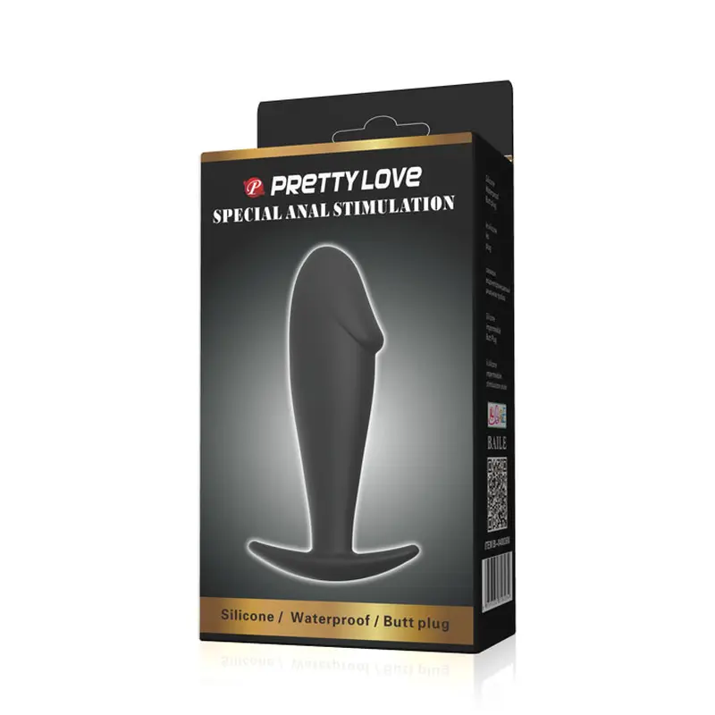 Анальний корок чорного кольору. Виготовлена з гіпоалергенного силікону з шовковистим покриттям. Виконана у вигляді пеніса з яскраво вираженою реалістичною головкою та широкою основою для комфортного використання.