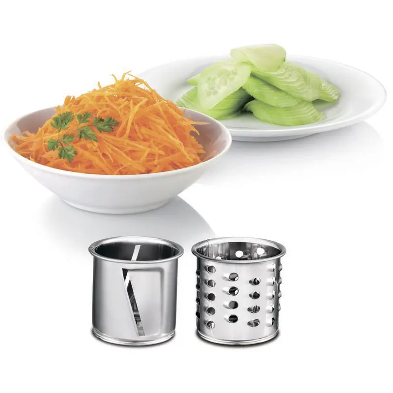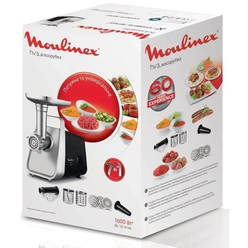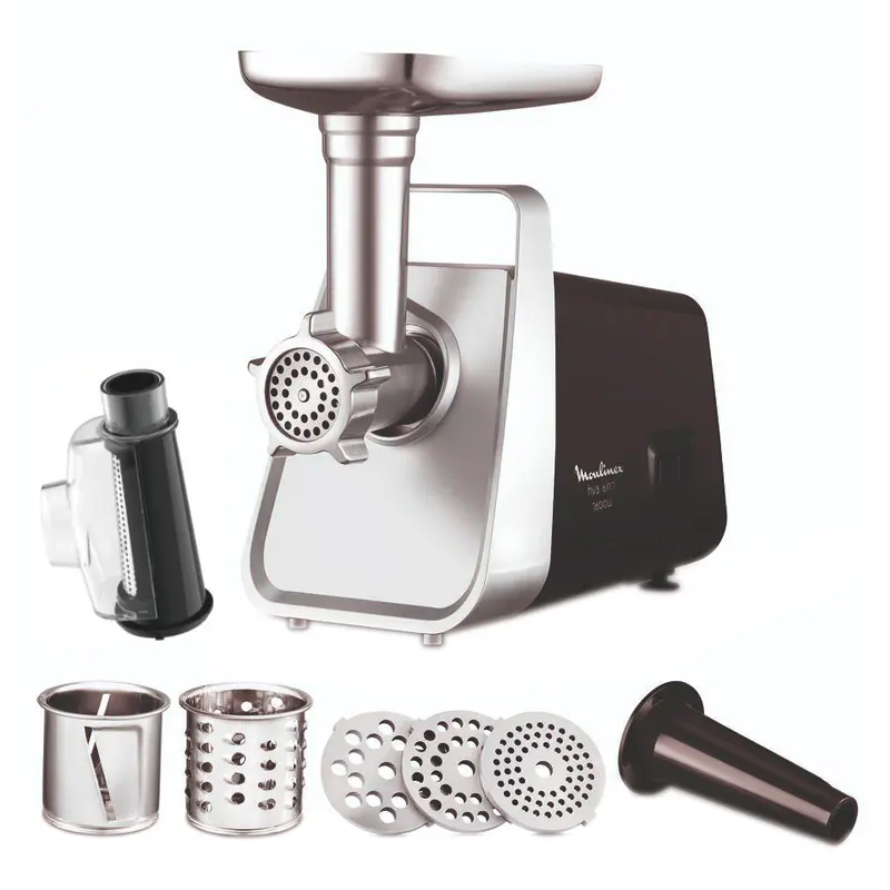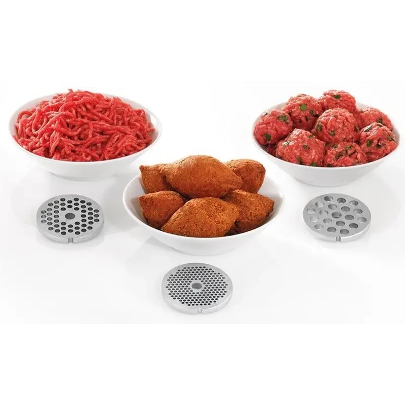 М'ясорубка з високою потужністю 1600 Вт та продуктивністю до 1,9 кг в хвилину швидко подрібнить навіть тверде м'ясо. Насолоджуйтеся різноманітністю різних рецептів, які ви можете легко приготувати завдяки універсальності пристрою: 3 різні решітки для м'яса (для дрібного, середнього, грубого подрібнення), насадка для томатів і ягід, 2 барабана для терки/шинкування, насадка для ковбас.
