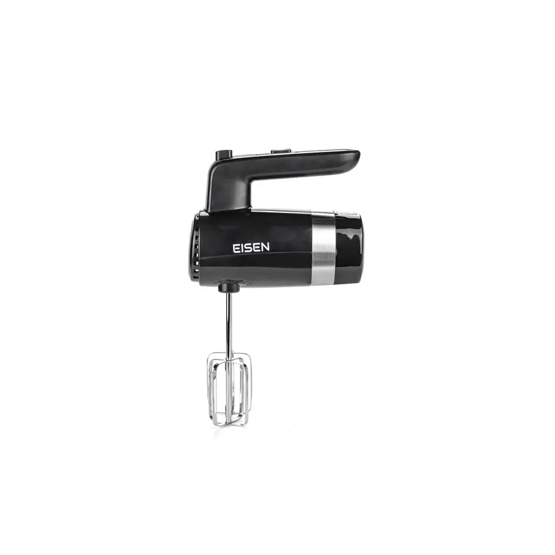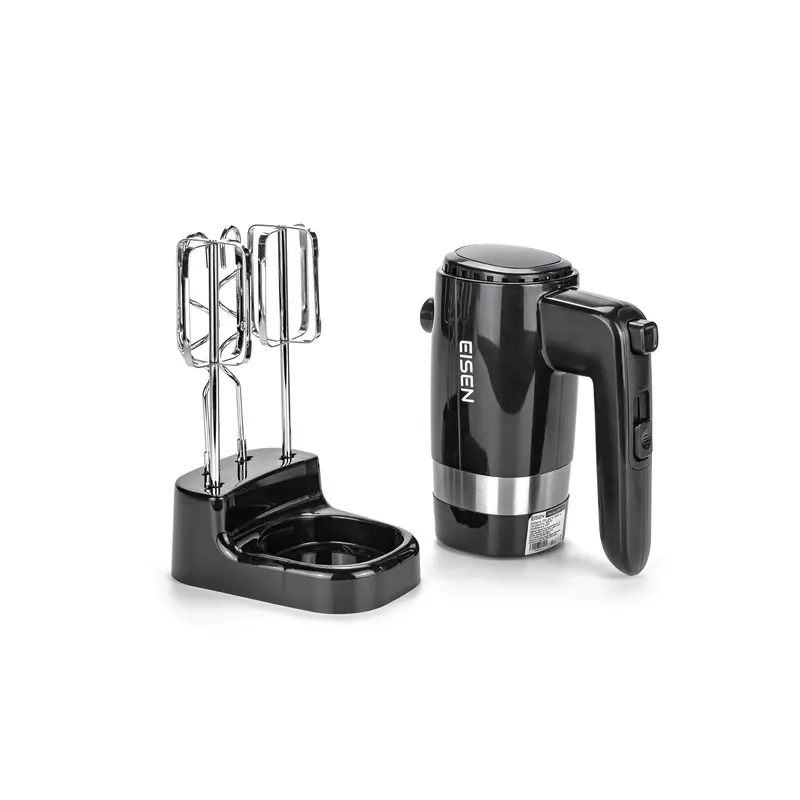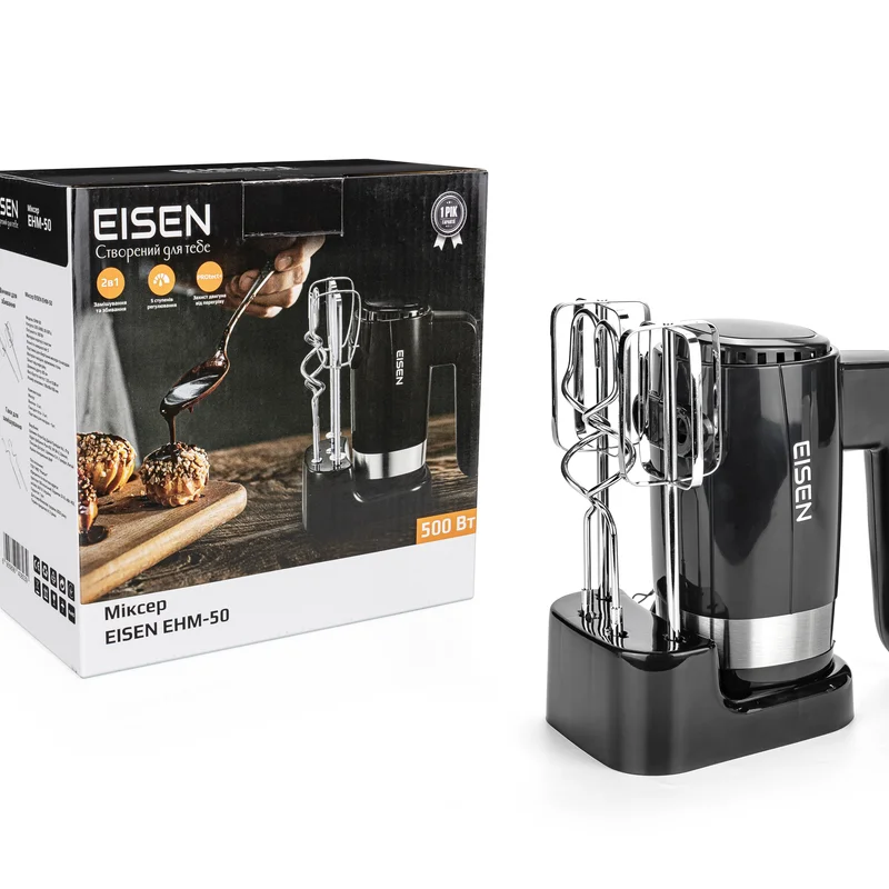Ручний міксер EISEN EHM-50 є універсальною моделлю "2 в 1" і надійним помічником на кухні. Він має потужність 500 Вт і швидко впорається з різними кулінарними завданнями. У нього є два вінчика для збивання та два гаки для тіста, а також п’ять ступенів регулювання швидкості та турбо-режим. Головною особливістю цієї моделі є підставка для зберігання міксера та насадок. Щоб забезпечити безпечну роботу пристрою, він має функцію захисту від перегріву. EISEN EHM-50 добре підходить для приготування кремів, мусів, пюре та замісу тіста різної консистенції. Зручне користування Міксер EISEN EHM-55W має підставку для зберігання міксера та насадок, що забезпечує зручне зберігання і зменшує ризик втрати деталей. Дріт міксера має довжину 80 см, що забезпечує достатньо довжини, щоб легко переміщувати міксер по кухні. Потужність та ефективність Завдяки потужності в 500 Вт і 5 швидкостям змішування, ви можете легко приготувати будь-яку страву. Захист від перегріву Безпечну та ефективну роботу пристрою забезпечує функція захисту від перегріву, завдяки якій прилад не перегрівається. Низький рівень шуму У робочому стані міксер має низький рівень шуму, що робить його використання ще більш приємним. Комфортна експлуатація Ергономічна форма, зручно розташовані кнопки управління та перемикання швидкостей дозволяють керувати міксером однією рукою. Оптимальні розміри та невелика вага, забезпечують комфортне користування пристроєм та зручне зберігання.