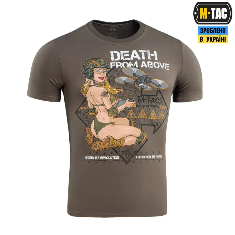 На принті зображена кокетлива й надзвичайно приваблива дівчина в стилі Pin-Up, що випромінює красу та силу характеру. Вона впевнена та сильна, спокуслива й рішуче налаштована на знищення ворогів. Красуня в спеціальних окулярах майстерно управляє FPV дроном, який несе полумяний "привіт" окупантам з неба. Зверху принта розміщений напис "Death from Above", натякаючи на те, що ворогові не вдасться сховатись від маленького, прудкого та смертельно небезпечного "поштового голуба".