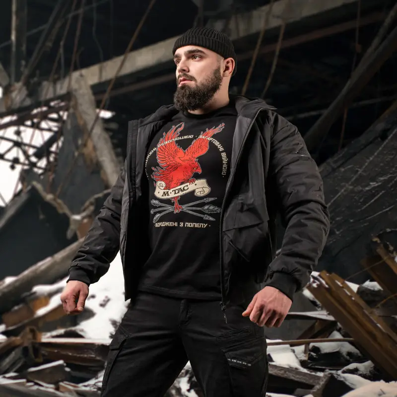 На принті зображений фенікс - символ відродження, сили та надії. Три стріли, які він тримає в лапі - відображають ракети, випущені окупантами. Зверху принта розміщено гасло М-Тас "Народжені революцією - Загартовані війною", а додана фраза "Відроджені з попелу" - відтворює сьогодення бренду. На спині зображене полум’я, три схрещені стріли, та чорна дата для М-Тас - 02.01.24.